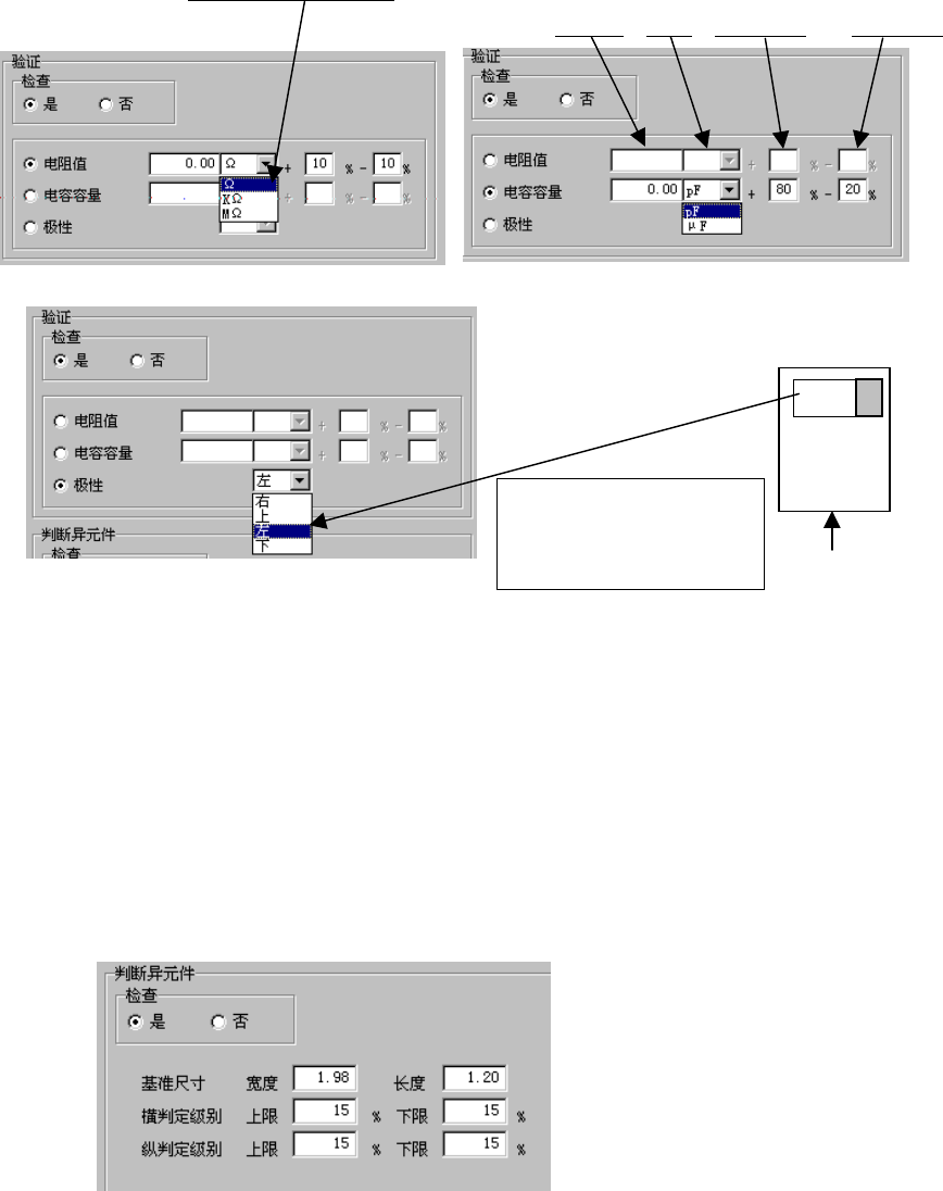 指定是否检查电阻值、电容器容量、极性,并设置其判定值。