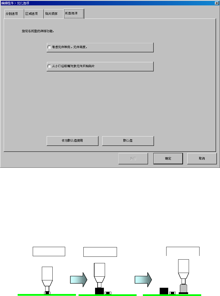 第1部 基本编 第4章 制作生产程序 4-96 4-4-1-2-4 机型选项 选择“机型选项”标签后,显示如下对话框。 图 4-4-1-2-4-1 优化 机型选项 (1) 考虑元件种类、元件高度 制作密集元件贴片(邻接贴片)的程序时,可设置自动考虑元件高度的元件层。 选中本项后,将按下列顺序进行贴片。 <考虑了元件种类、元件高度的贴片> 贴片顺序① 贴片顺序② 贴片顺序③
