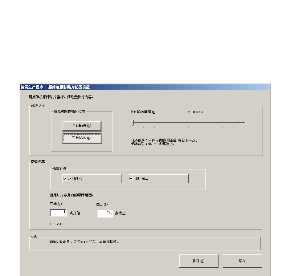第1部 基本编 第4章 制作生产程序 4-208 2) 跟踪范围 ●选择站点 :选择进行跟踪的站点。 请勾选入口站点、出口站点、或俩者都选。 在要跟踪的站点上贴片基板必须处于被钳夹的状态。 输入跟踪范围是从贴片数据的第几点到第几点。默认值为跟踪所有贴片点。 所有跟踪条件设置完毕,准备完成后,按下<START>开关或“执行”按钮。 按下“取消”按钮时,会返回原来的画面。