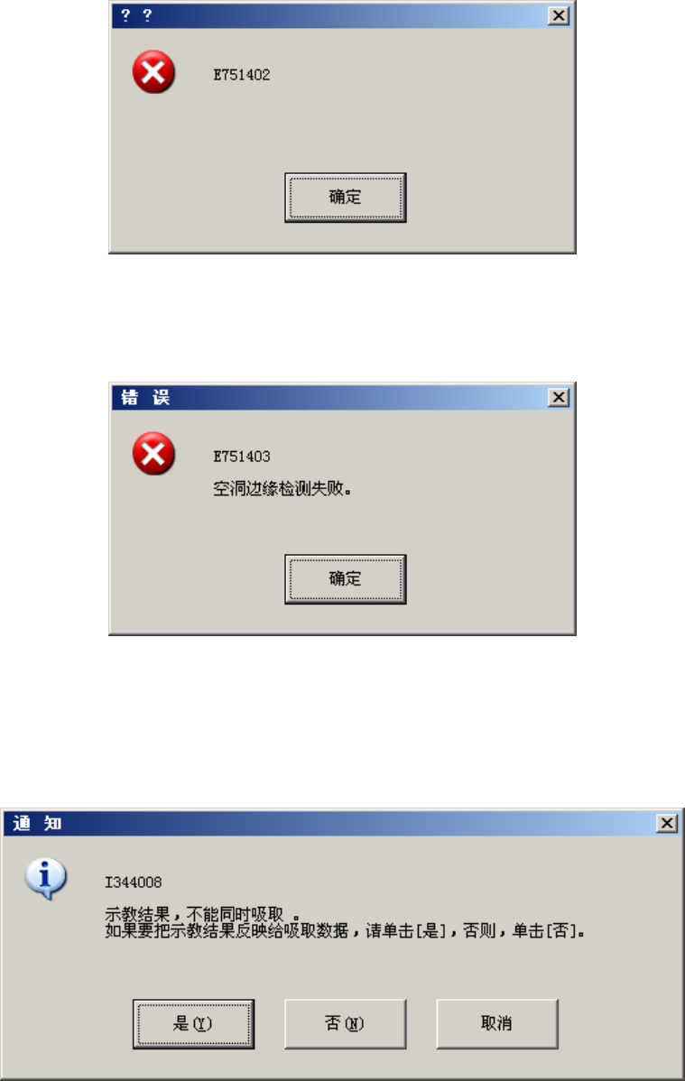 第1部 基本编 第4章 制作生产程序 4-233 3) 中心偏移时 设置的吸取数据与自动示教校正的吸取数据差距过大时,显示如下错误提示。 图 4-5-4-7-2-26 错误 空洞的中心明显偏移 4) 空洞边缘检测失败时 空洞影子的边缘框检测失败时,显示如下错误提示。 图 4-5-4-7-2-27 错误 空洞边缘检测失败 5) 因自动示教出现不能同时吸取时 出现不能同时吸取时,显示如下询问。 精度优先的情况下请按[是],速度优先的情况下请…