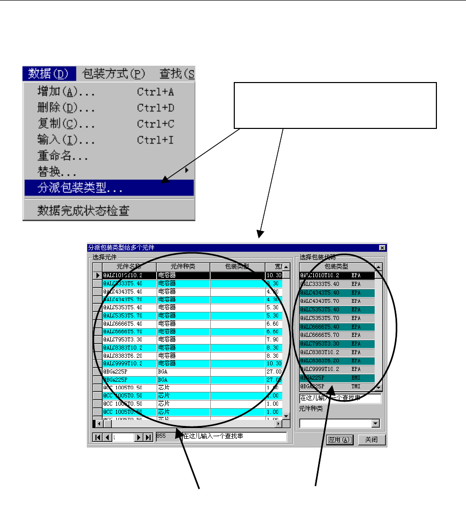 第1部 基本 编 第5章 数据库 5-22 5-4-6 分派包装类型 可以对多个元件数据统一设置包装类型。 (1)在“数据”菜单中选择“分派包装类型…”后,会显示如下画面。 在“分派包装类型”画面上,会显示元件数据清单表和包装类型清单。 元件数据清单 包装代码清单 图 5-4-6-1-a,b 菜单栏、分派包装类型 点击 “分派包装类型” 后,可显示 “分派 包装类型给多个元件”画面。