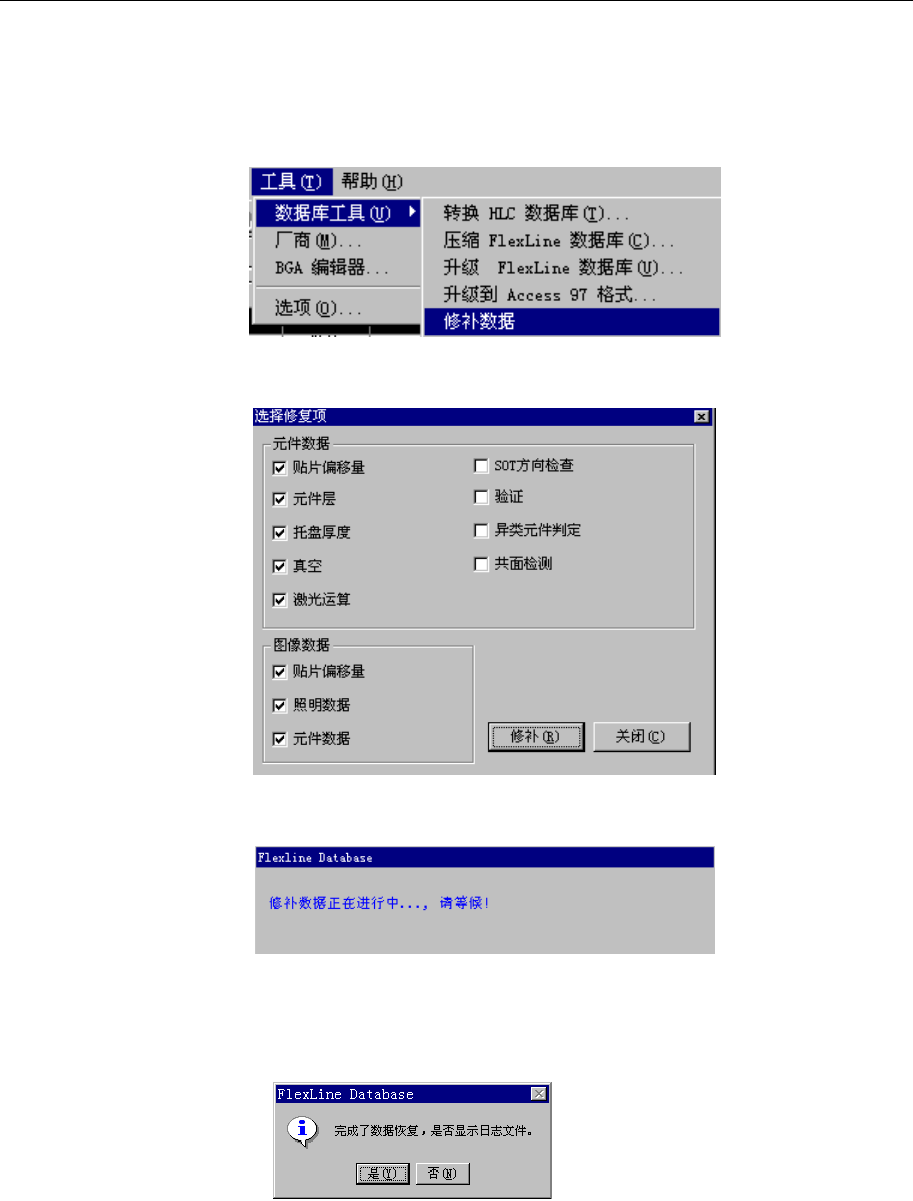 第1部 基本 编 第5章 数据库 5-31 5-6-1-4 修补数据 将数据注册到Flexline数据库时,有时会把超出输入范围的数值注册进去。 使用“修补数据”菜单,可以统一修补这些不正确的数据。 <步骤> ①在菜单栏中,选择“工具”-“数据库工具”-“修补数据” 。 图 5-6-1-4-1 ② 显示如下画面。选择修补项目,单击“修补”按钮,即可开始修补。 图 5-6-1-4-2 ③数据修补时会显示如下提示信息。 图 5-…