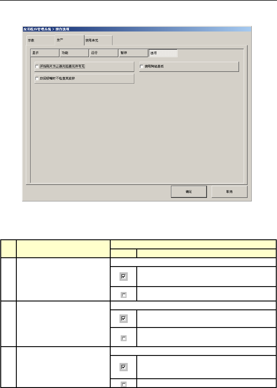 第2部 功能详细编 第6章 操作选项 6-16 6-3-5 选项 在没有通过 MS 参数设置任何选项的情况下,画面上不显示“选项”按钮。 图 6-3-5-1 生产时的检查选项 表 6-3-5-1 生产时检查选项的设置细节和内容 内容 No. 项目 状态 动作及详细内容 设置在贴片之前是否用激光识别装置检查有无元件。 在贴片之前用激光识别装置检查有无元 件。 检查结 果为没有元件时,画面显示“元件掉落” 。 1 开始贴片为止激光检查元件有…