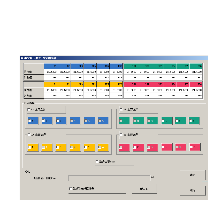 第2部 功能 详细编 第1 0章 自动校准 10-5 (1) 保存值/计测值 保存值显示在 MS 参数中设置的值,计测值显示测量的值。 显示后(马上) 、或未计测的 Head(贴片头)不显示计测值。 测量完成的,该 Head 计测值用蓝色显示。 发生测量错误时,用红色文字显示“Err(错误) ” 。 (2) Head 选择 在 Head 选择组的勾选栏选择需要计测的贴片头。可以同时选择多个贴片头计测对象。 在各贴片头单元的[全部选择] …