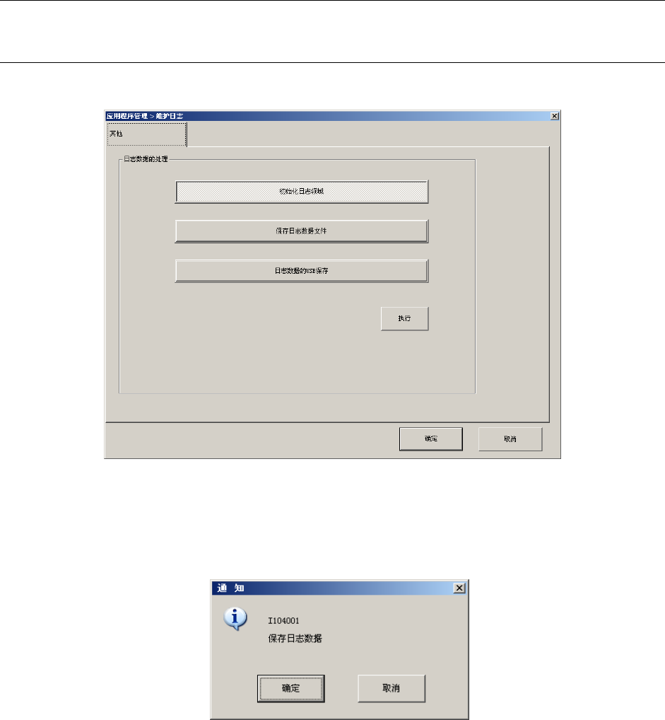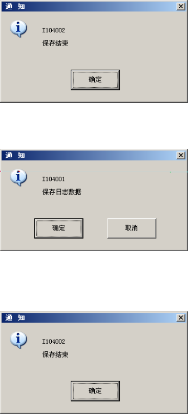 第 2 部 功能详细编 第 13 章 程序补充 13-32 图 13-8-1-3 保存结束信息框 点击[日志数据的 USB 保存],按[执行],则显示确认信息框。 图 13-8-1-4 保存确认信息框 点击[确定]按钮则执行保存。点击[取消]则不保存并返回。 保存结束则显示信息框。 图 13-8-1-5 保存结束信息框