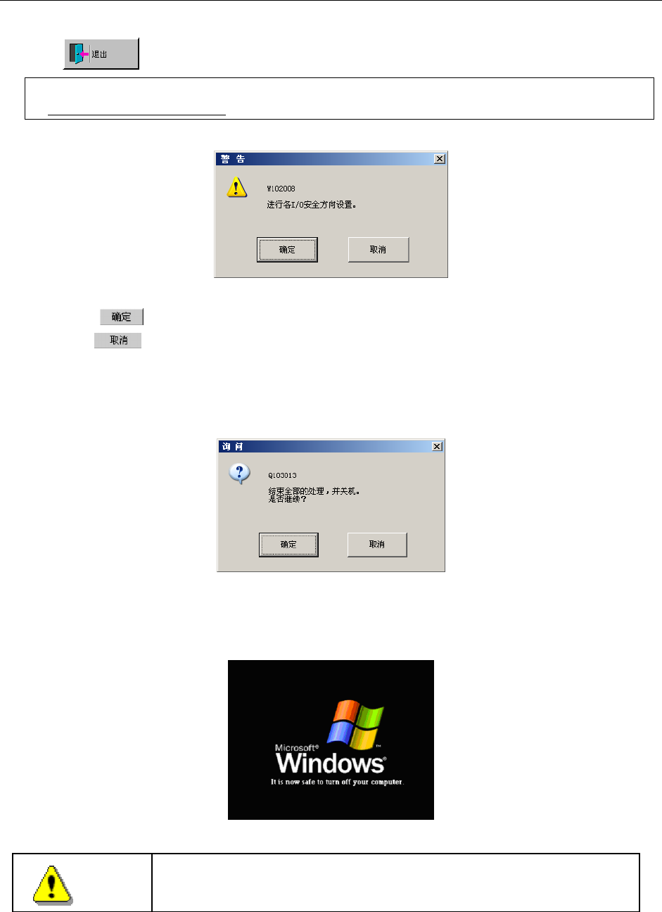 第1部 基本篇 第2章 生产 2-9 2-3-2 设备的结束方法 (1)请按命令按钮中的退出按钮。 按下该按钮。 按下退出按钮后如还有未保存的生产程序时,会显示可能丢失生产程序的提示。 若要保存程序请选择[取消] ,中断结束处理,返回到桌面。 (2)在系统结束前,会显示确认设置各安全方向的信息。 图 2-3-2-1 确认设置安全方向的信息 按下 :进行各种安全方向的设置。 按下 :不进行安全方向的设置而直接进入下一步。 (3)显示确认结…