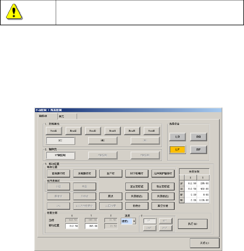 “手动方式” :在简易控制画面上,控制 XY 轴、控制 Z 轴、操作 ATC 开关,将贴片头移动到方