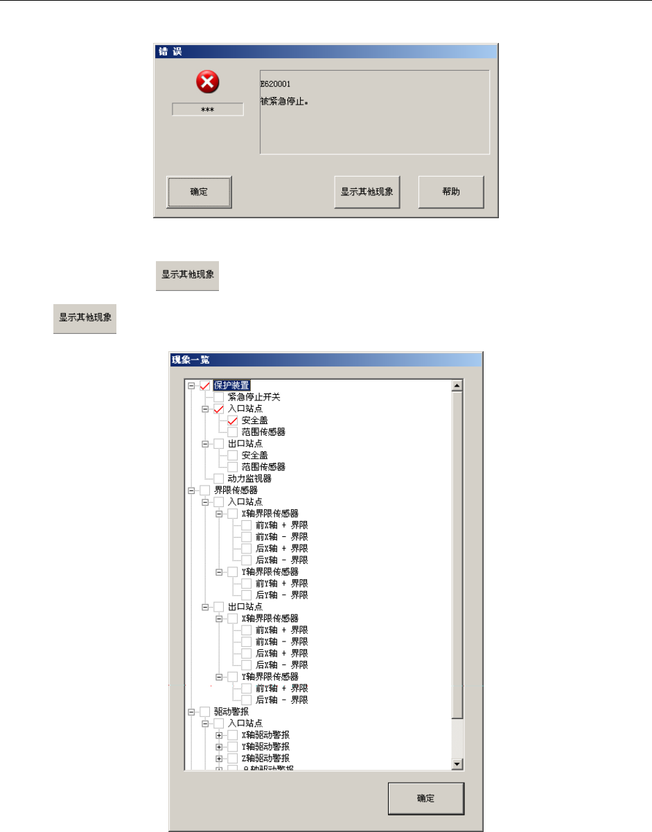 打开安全盖、按下紧急停止开关、或检测到各轴的伺服驱动的警报等时,会显示如下画面。