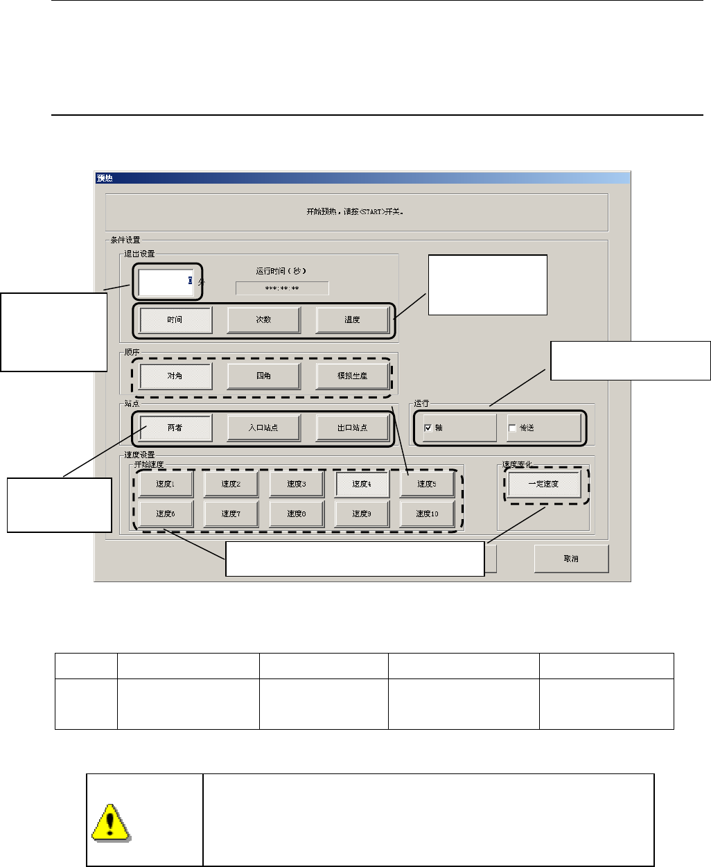 第1部 基本篇 第2章 生产 2-18 2-4 预热 主要在节假日结束后或在寒冷地区使用时,需在接通电源后立即进行预热。 预热的时间根据具体情况而定,大致10分钟左右。 2-4-1 初始画面 从主画面的菜单栏中选择“维护”→“ 预热”后,显示如下预热初始化画面,请设定预热条 件。 图 2-4-1-1 预热初始化画面 根据用户级别,画面的部分项目有下列变化: 项目 顺序 站点 速度设置 速度变化 显示 修理工程师以下 不显示 修理工程师以…