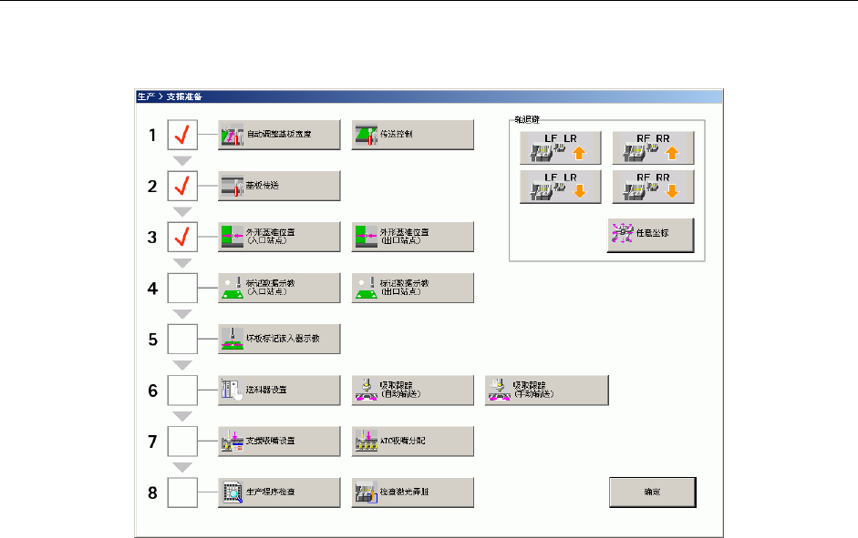 第1部 基本篇 第2章 生产 2-30 2-7-1-2 传送轨道宽度的调整 <在“自动调整基板宽度画面”的调整方法> (1)请从菜单栏选择[生产]-[支援准备] 。 图 2-7-1-2-1 支援准备