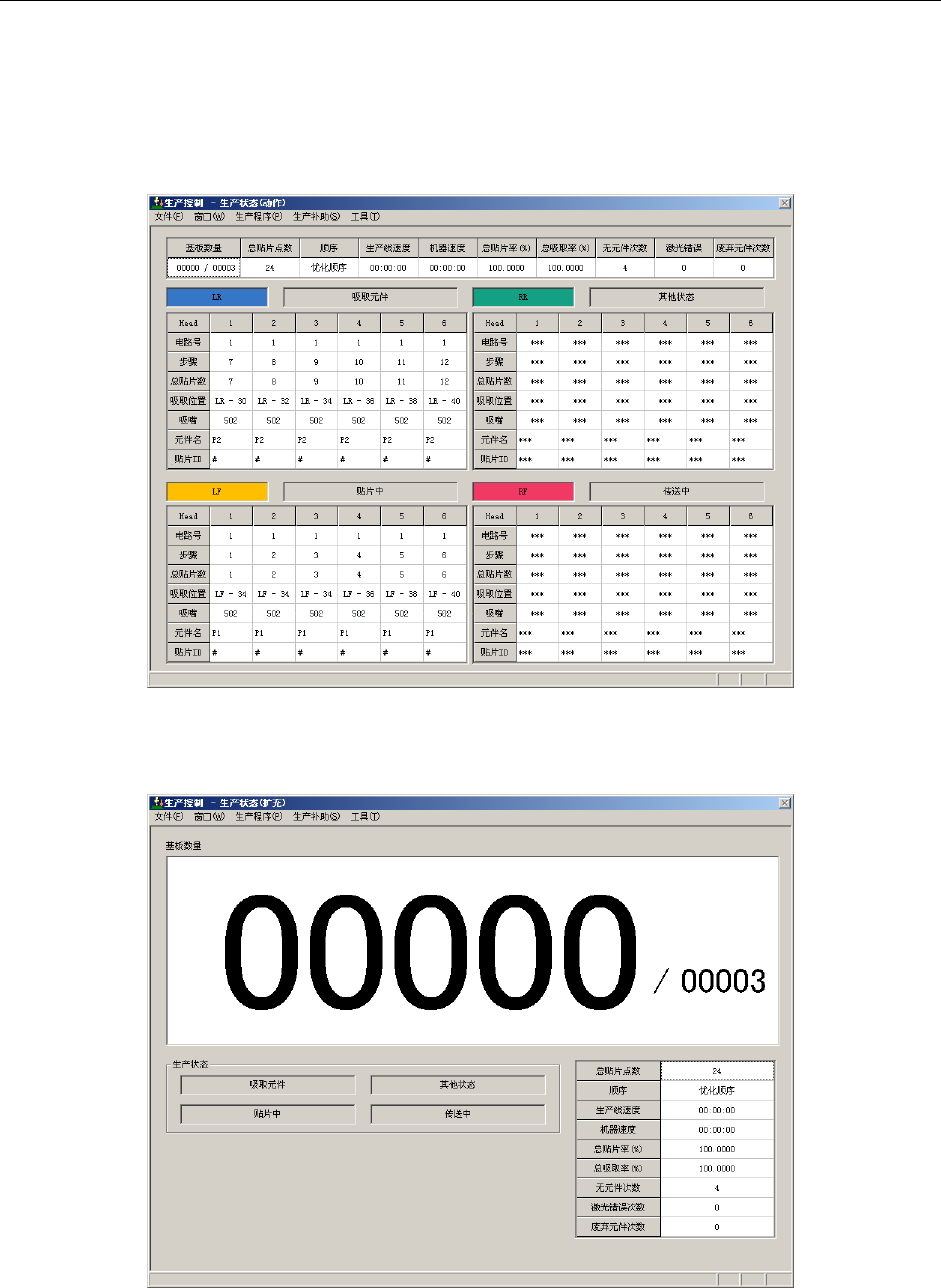 第1部 基本篇 第2章 生产 2-55 2-8-3-1 生产状态(动作) 按下<START>开关开始生产后,若操作选项的 “生产(显示)”标签中没有选中 “生产中显示 设备画面”选项,则会显示生产状态(动作)。 画面根据“工具”/“操作选项”的“生产(显示)”标签上的设置(是否选中“放大显示生产 基板数量”),有不同的显示。(参见第6章 操作选项) ◇ 通常的生产状态显示画面 图 2-8-3-1-1 生产状态显示画面 ◇ 在…