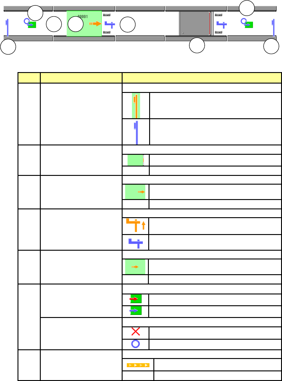 第1部 基本篇 第2章 生产 2-61 (3) 传送信息(例:传送方向 左→右、前面基准) 1)显示 以图示符号显示传送状态。 图 2-8-3-2-4 传送显示 各显示项目的说明 2)图示符号的说明 No 项目 显示 显示 In、Out 传感器的状态。 打开状态 1 In、Out 传感器 1-1: In 传感器 1-2: Out 传感器 关闭状态 显示等待传感器的状态。 打开状态 2 等待传感器 J 等待传感器 无显示 关闭状态 显示停…