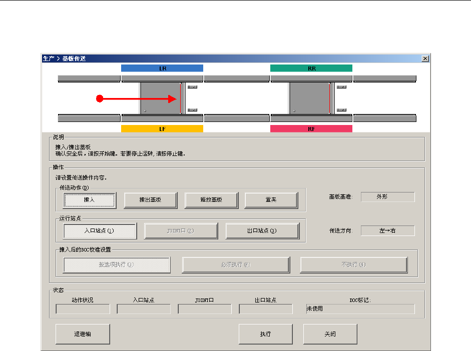 第 1 部 基本编 第 2 章 生产 2-104 2-11-1-4 基板传送 在传感器状态画面显示后,执行传送动作,调整搬入、搬出基板、释放基板、重夹。 图 2-11-1-4-1 基板传送画面 详见“第 4 章 制作生产程序 的 4-5-4-1-1 基板控制” 。 关于 BOC 校正,请参见“第 6 章 操作选项 的 6-2 示教”的记述。
