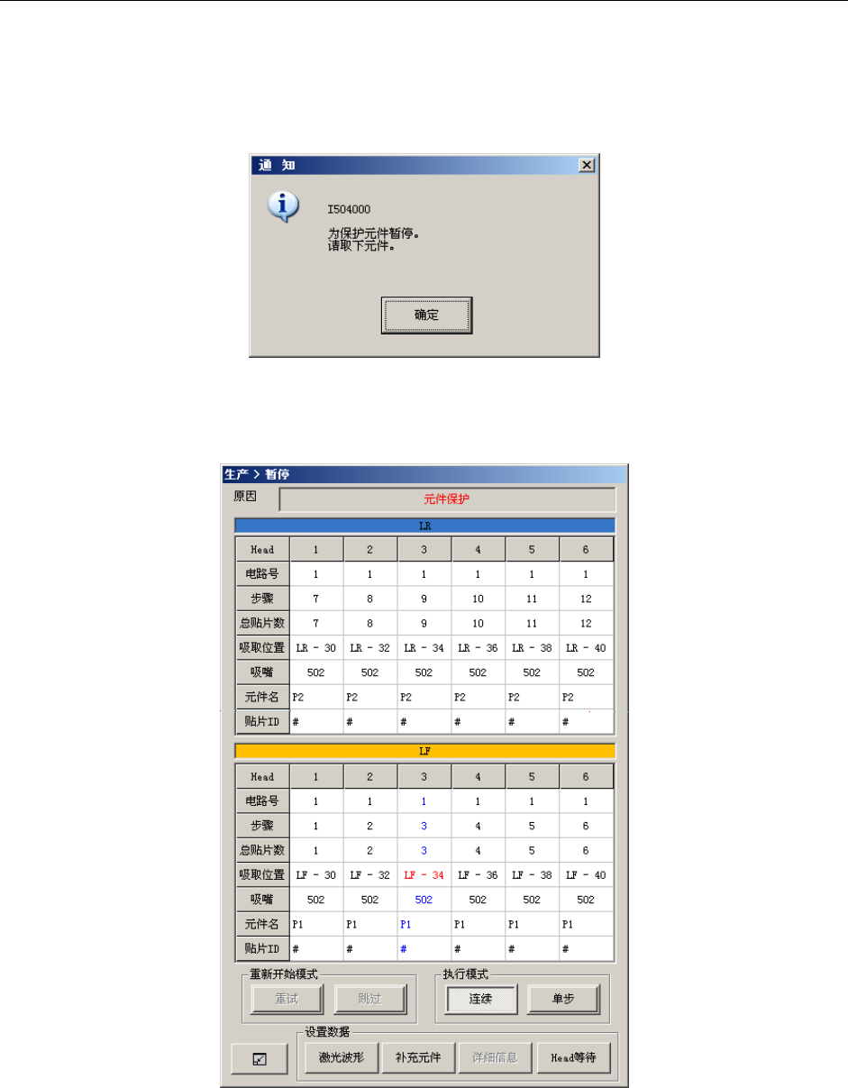 当暂停的原因为激光头弄脏、芯片站立错误、激光识别错误、异元件错误时,暂停对话框中会显