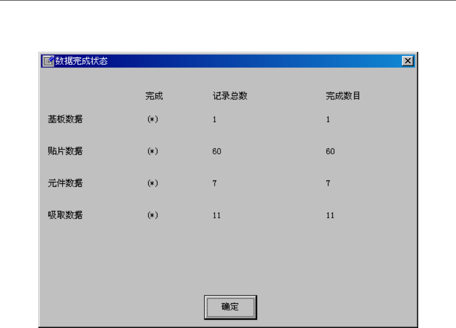 第1部 基本编 第4章 制作生产程序 4-85 4-3-7 数据完成状态 检查数据的完成状态。若未完成则不能进行优化。 从菜单栏中单击“数据”/“数据完成状态”后,会显示如下画面。 图 4-3-7-1 数据完成状态 如果记录总数和完成数目一致,则表示数据已完成,在完成的“( )”中显示“*”。 另外,“吸取数据”及记录总数为0的项目,即使不显示“*”,也被看作完成。 有未完成的项目时,请完成该项目。