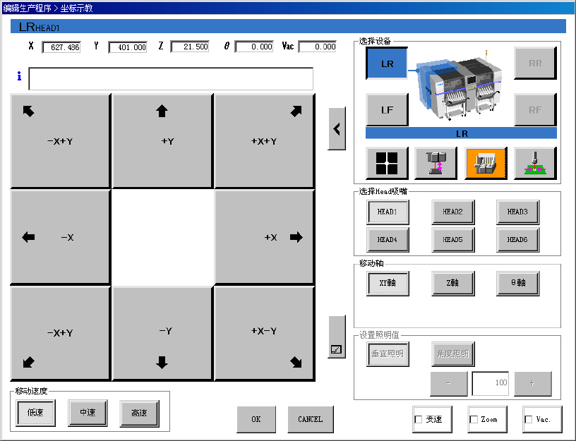 选择移动轴的[Z 轴]按钮,用上下方向按钮上下移动吸嘴贴片头。