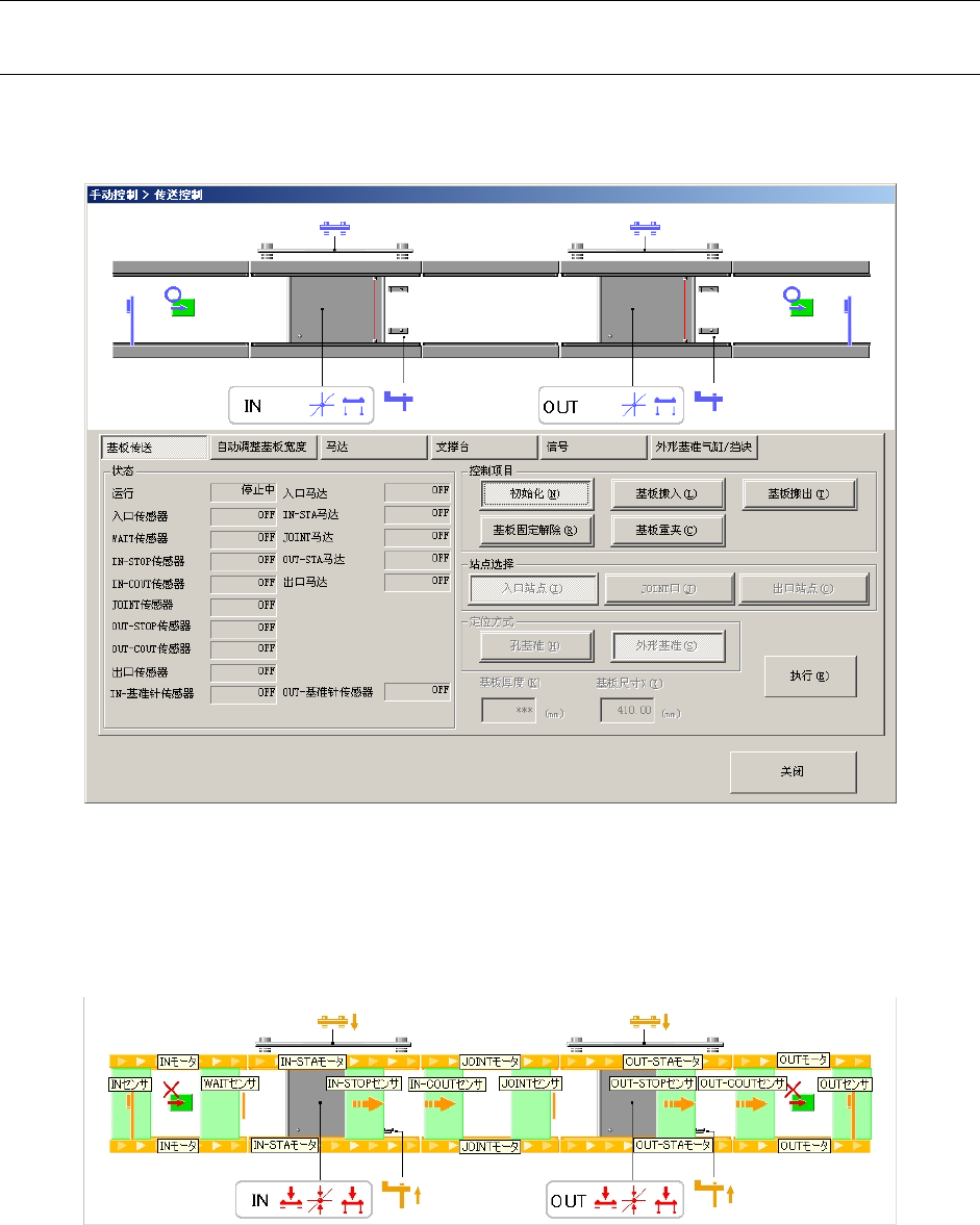 在传送控制画面的上方,通过图形方式显示传送马达/传感器现在的状态。