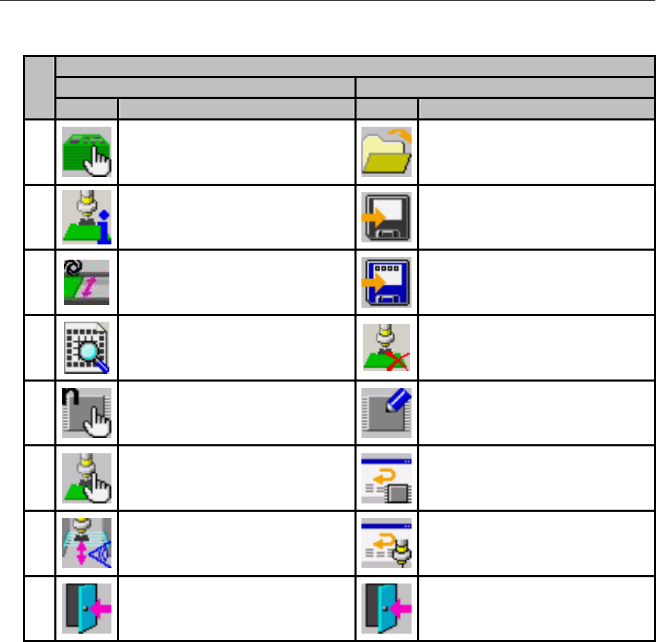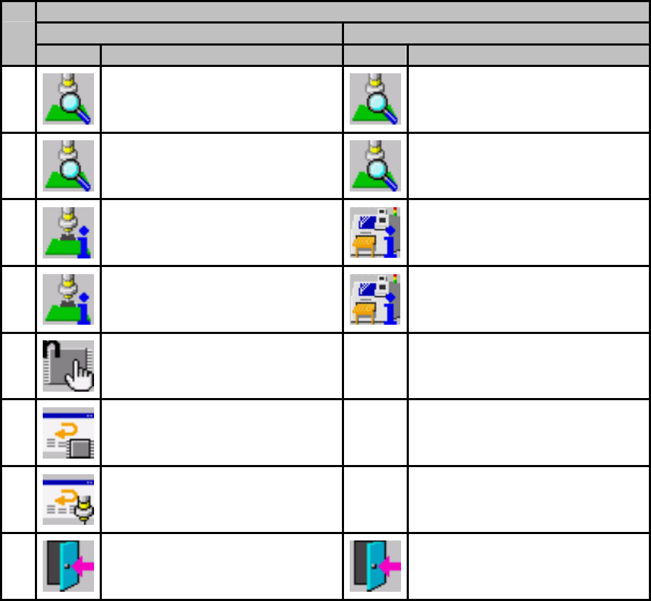 第 1 部 基本编 第 1 章 设备概要 1- 59 生产控制、生产中 页 1/2 2/2 No. 图标 名称 图标 名称 1 生产状态(设备) 生产状态(放大) 2 生产状态(运行) 生产状态(真空) 3 生产管理信息(综合) 生产管理信息(供应) 4 生产管理信息(吸取率) 生产管理信息(贴片头) 5 设置元件数 6 重试列表(未贴片) 7 重试列表(供应设备) 8 退出 返回桌面 退出 返回桌面