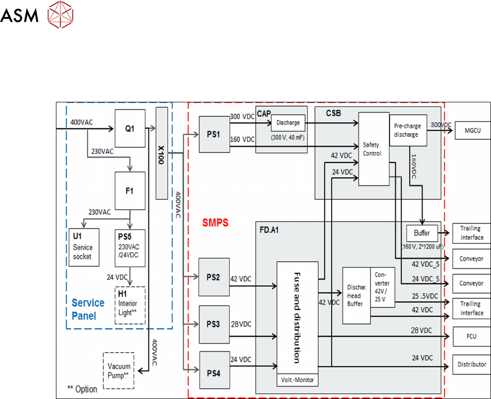 7 电源 7.3 电压概览方框图 104 技术培训 FSE SIPLACE TX系列 08/2018 7.3 电压概览方框图 7.3.1 TX 电源电路图 上图所示为 SMPS 所生成电压的简要概览。 ● 电源组 PS1 将主输入交流电源电压转换为 300 VDC(用于主轴的中间电路电压)和160 VDC(用于贴片头轴的中间电路电压)。 ● 300VDC 经由储能电池 CAP1 到接触式安全断路器(CSB),充放电通过预放电/放电板 A…