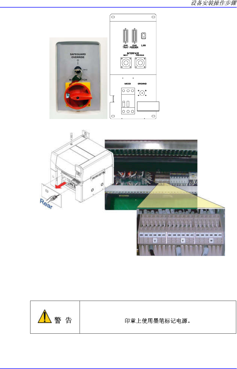 7-13 5. 在确 认 了设 备 变 压器 的 原 始状 态 后 . 请 把变 压 器 的输 入 电 压设 置成 与安 装现 场 的供给电压相符。 变 更 变 压 器 输 入 电 压 时 , 请 同 时 变 更 设 备 电 源 标 签 上 的 电 压, 使两 者 保 持一 致 。否 则, 因输 入电 压不符 , 导 致设 备 损 伤 . 此时, S/N 确认前后 面应急 开关是否断开,前后门是否已关闭 OFF REAR Set up …