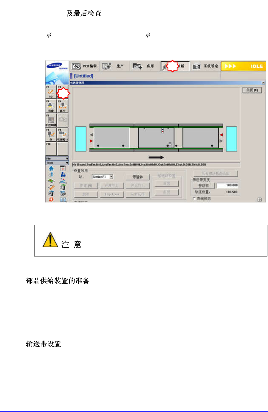 2. 在’Conveyor Utilities’对话框中投入 Test PCB,确认各 Station 的基板检查传感器
