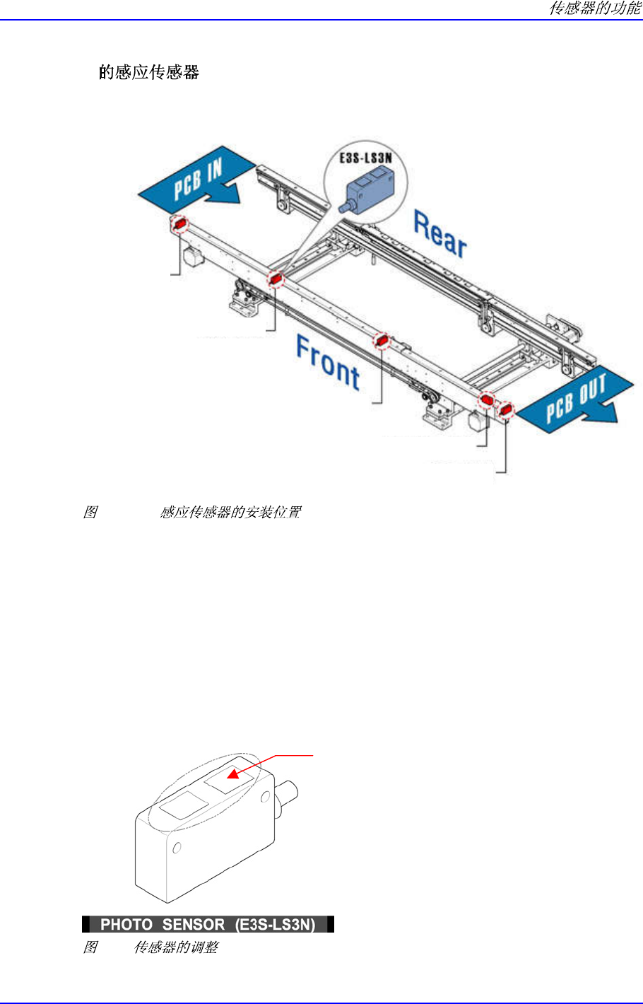 5-3 5.3. PCB 传送装置 (Conveyor) 的 PC B 输入 / 输出路径上安装了 4 个 PCB 的感应传感器。 5-2. PCB 各传感器位置及感应内容如下。 入口传感器 : 感应从前面 工序到本设备的 PCB 的进入。 等待传感器 : 感应在等待 缓冲区 ( 部品实际贴装等待位置 ) 中的 PCB 。 贴装传感器 : 感应贴装缓 冲区 ( 部件实际贴装位置 ) 中的 PCB 。 快速安装传感…