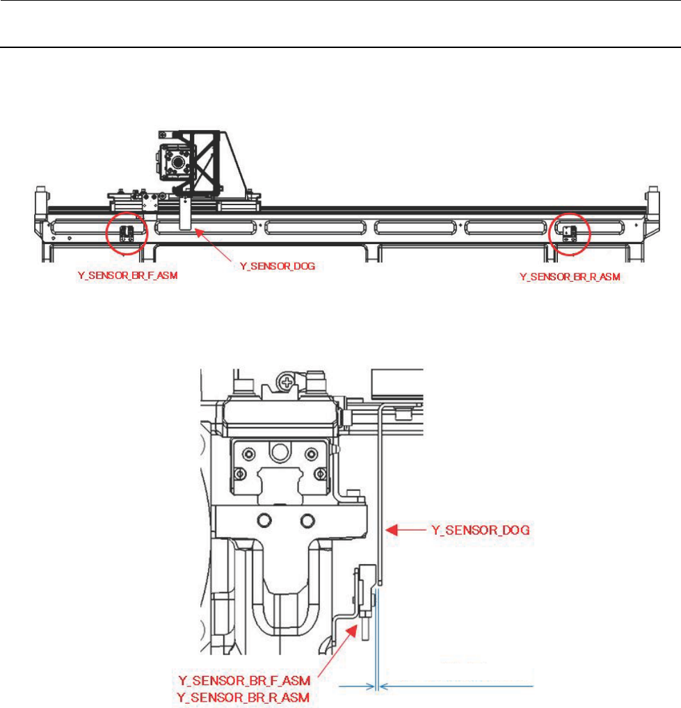 1) 松开 Y 极限传感器托架的止动螺丝进行调整,离开座架之开尾销安装中心位置的距离要成为下图