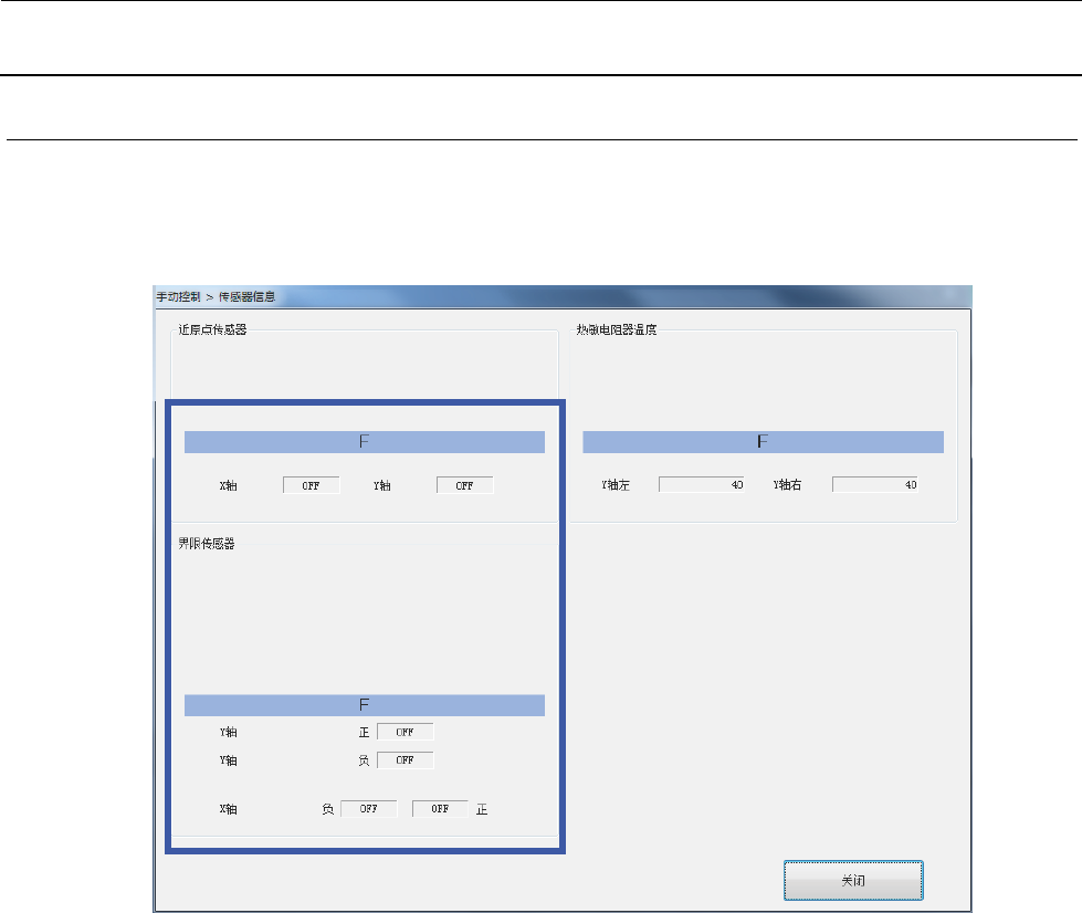 1) 各轴以手动方式移动,通过“手动控制”→“传感器信息”确认接近传感器(显示是原点传感器)、