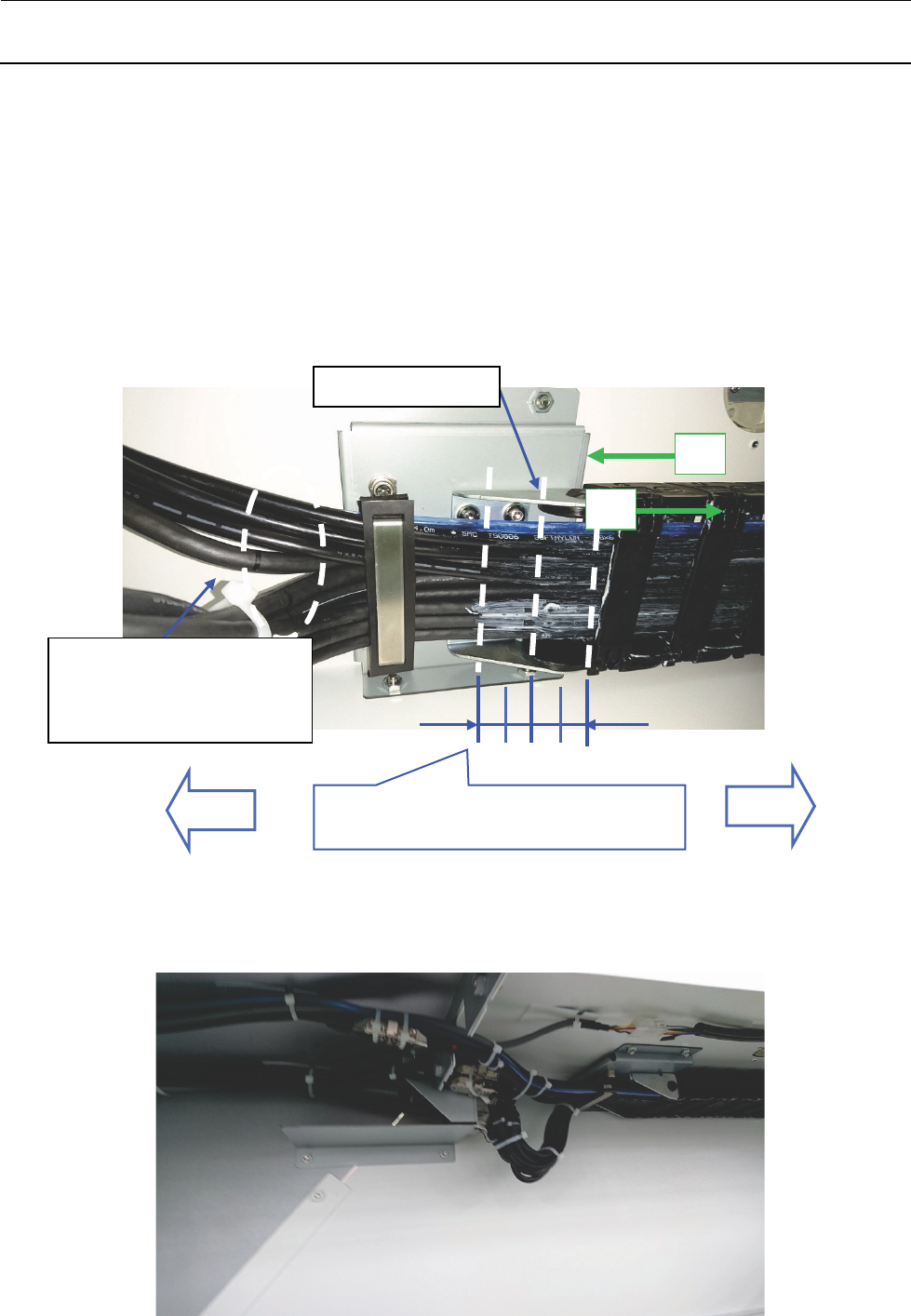 5) 调整线束,使 2 条记号的中间位置成为 X 电缆拖链的端部,再予固定。