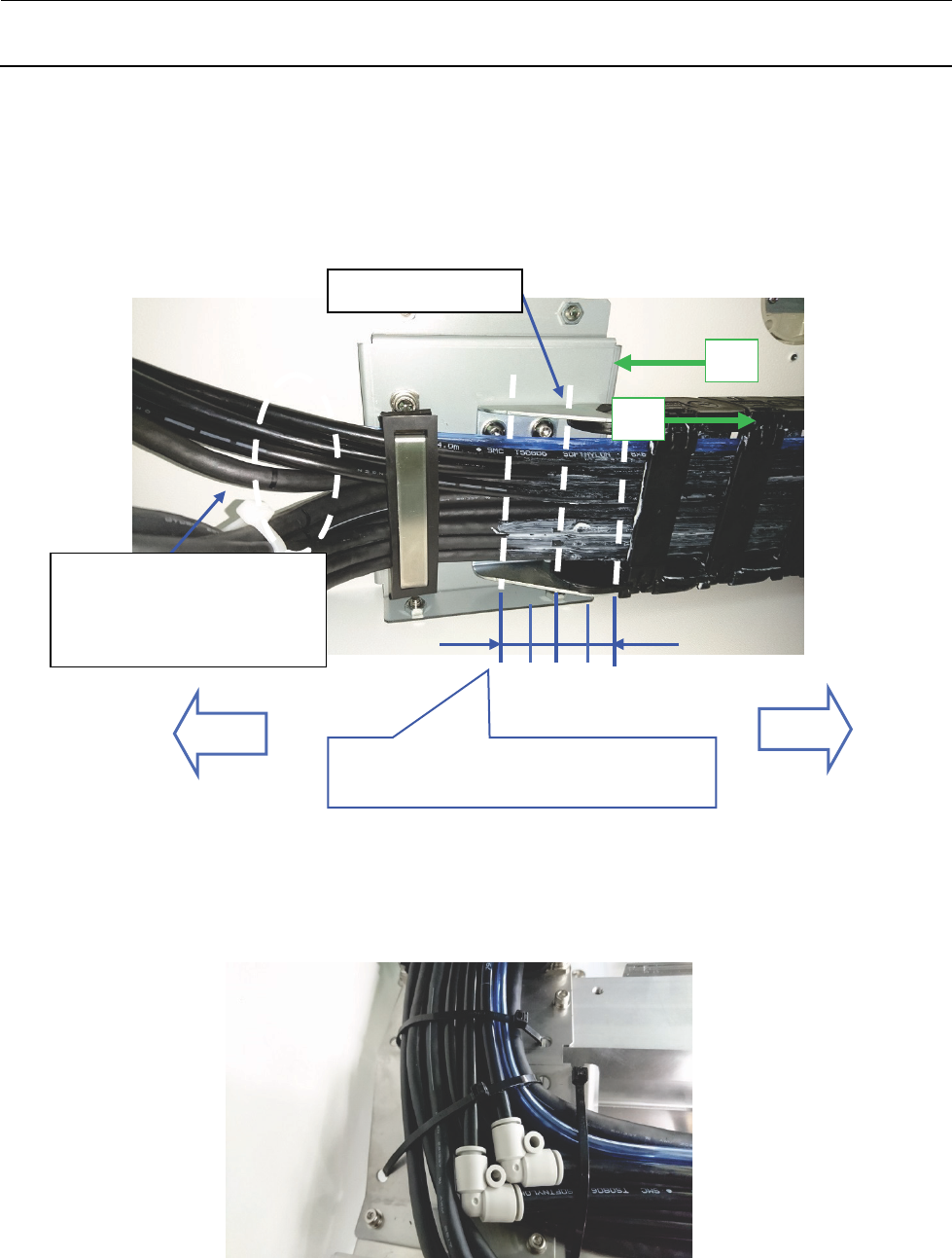 6) 调整线束,使 2 条记号的中间位置成为 Y 电缆拖链的端部(移动端部),予以固定。