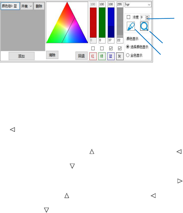 5 元件制 作 说明 5.1 图像、元 件、窗口操 作说明 1)滚动鼠标 滚动轮可放大 、 缩小图像, 点击 图像上任 意位置, 按下 鼠标右键拖动 鼠标, 可移动图像上 的位置 2)鼠标左键 选中元件或窗 口,拖动 鼠标和键盘方 向键可移动元 件或窗口,按 键盘上的 “Delete”可删 除元件和窗口 3)选中检查 窗口内的算法 ,抽取颜 色三角图标点 亮时,可对此 算法抽取颜色 ,抽取颜 色工具如下: A、 点击添加 ,可增加一组颜…