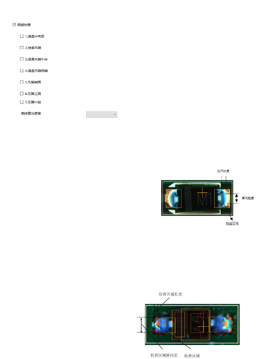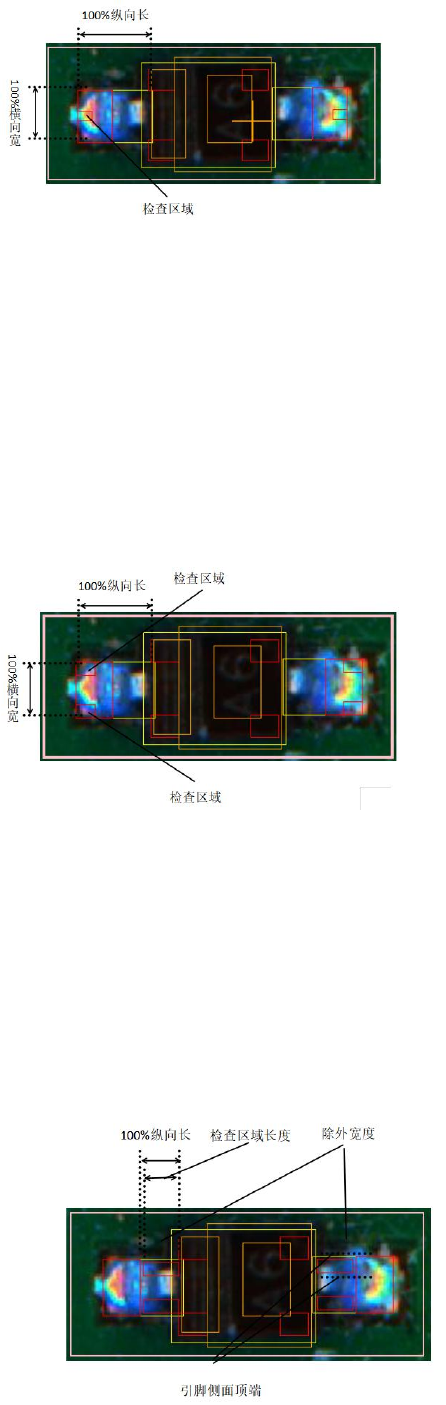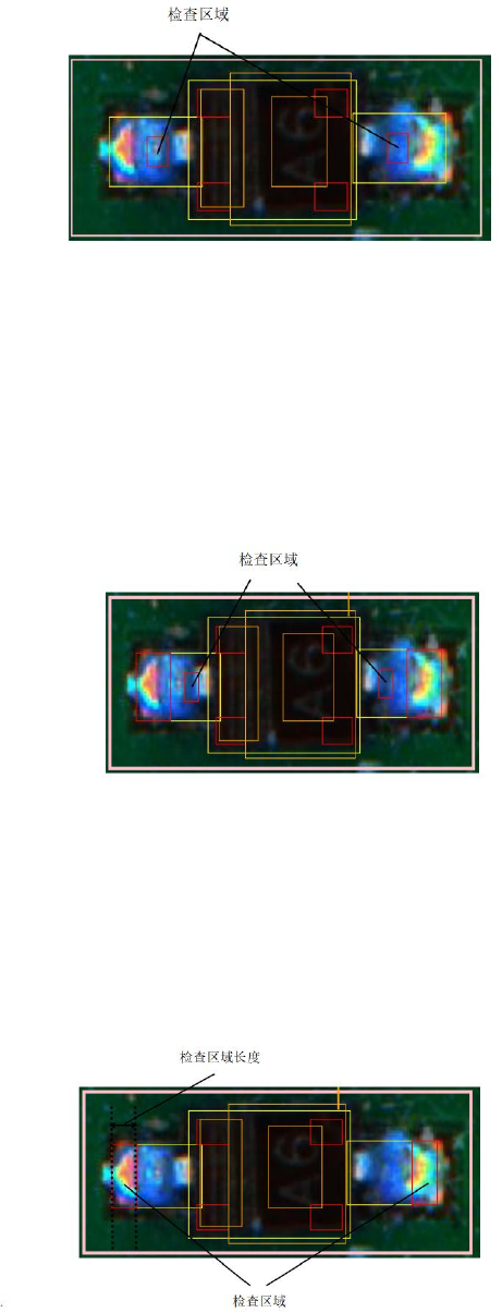 把焊盘的纵 向长、横 向宽作为 100% , 从焊盘末端开 始, 以设定的 比例作为检 查区域, 在焊盘末 端两角各 生成检查区 域, 如右图 标出的检查区 域 (检查区 域 长度 25% ) 3、焊盘末端 中央 检查区域_ __% 面积≥_ __% 抽取颜色: 点中焊锡末端 中央的任一项 设定,可以进 行颜色抽取, 此项目抽 取红色 处理内容: 在检查区域内 ,计算所抽取 颜色的面积占 检查区域的比 例,大于 等于面积设定 值,则 O…