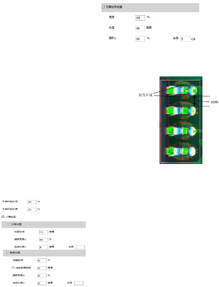10、引 脚变形检查 宽度___ % 长度___像 素 面积≤_ __% 抽取颜色: 点中引脚变形 检查的任一项 设定, 可以 进行颜色 抽取, 此项目抽 取红色 ( 引脚末段的颜 色) 5.5.3.2 IC 类元件引脚窗算法 1、引脚内 段长度 ___% 引脚外段长 度___% 不需要抽取颜 色 处理内 容: 宽 度 : 以 两焊 盘 的 间 距 为 100% , 设定 比 例 为 引 脚 偏 出检查窗的横 向宽度 长度 : 以设 定…