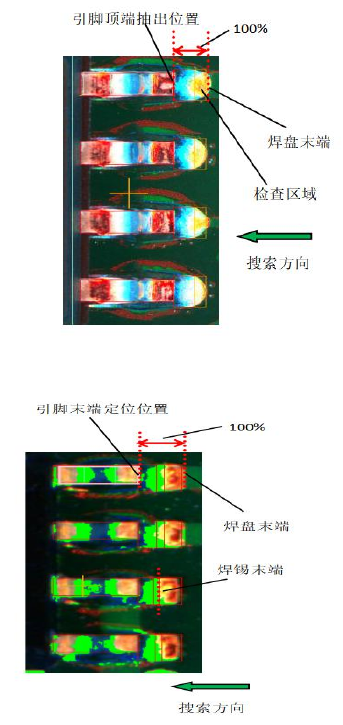 从焊盘末端开始往里搜索,所抽取的对象颜色的像素满足宽度设定比例的位置作为焊锡