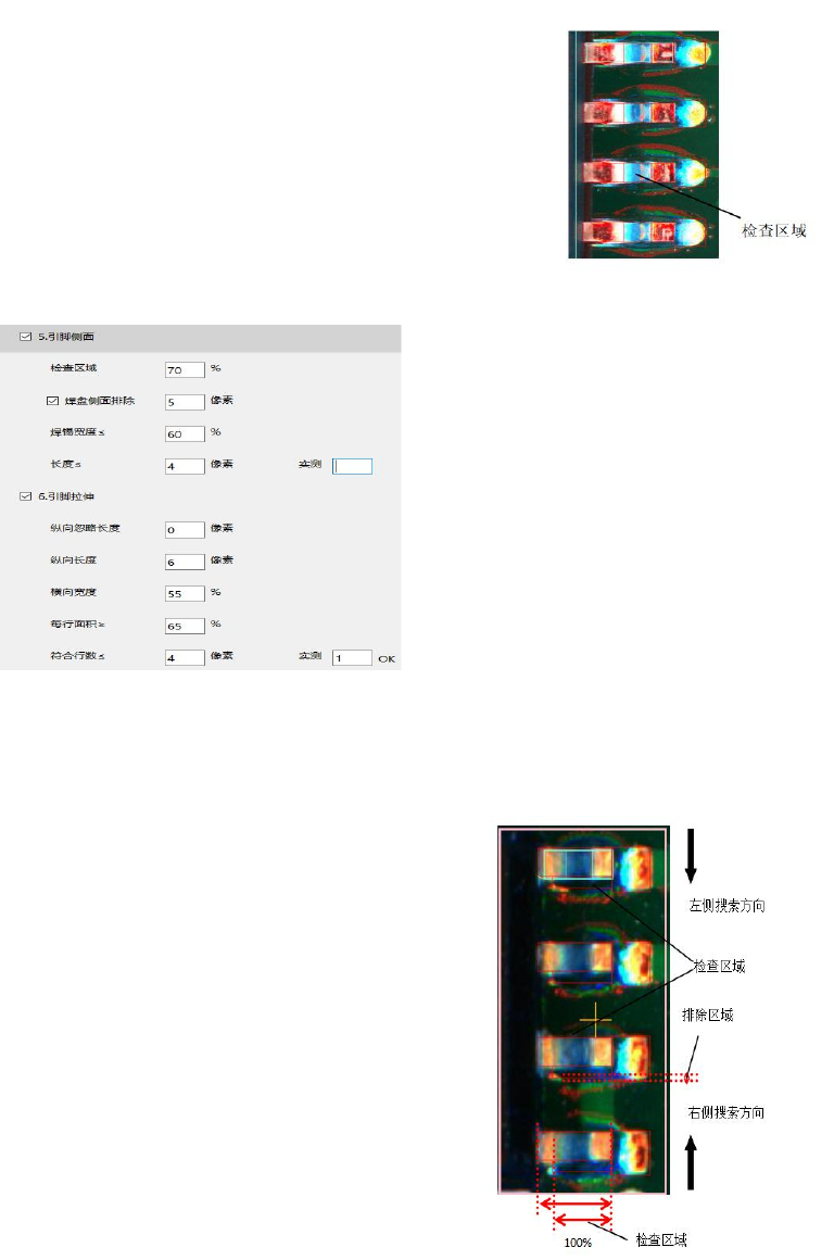 2、引脚正面 焊锡 纵向忽略长 度___像素 纵向长度_ __像素 横向宽度_ __% 面积≥_ __% 抽取颜色: 点中引脚正面 焊锡的任一设 定,可以进行 抽 色,此项抽取 蓝色 处理内容: 在检查区域内 , 计算所抽取颜色面 积占检查区域 的面积, 大于等于 面积设定值 , 则 OK, 小于面积设定 值,则 NG 3、引脚翘起 面积≥_ __% 抽取颜色: 点中引脚翘起 的任一设定, 可以进行抽色 ,抽取引脚外 段的红色 纵向忽 …