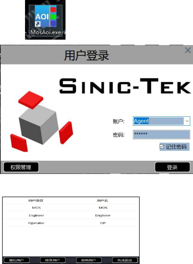 2、软 件界 面 说明 2.1 登录界面 运行桌面 ,进入登录界面 点击“进入系统” ,登陆到软件主界面;点击“权限管理” ,弹出如下 用户名权限分 为 Movision 、Engin eer、Op 三类用 户权限 MOS:高级 用户 Engineer:工程师 用户 Op:操作员 MOS 高级 用户权限, 可设置其他用户权限 , 可修 改软件、 硬件配置, 可校 准机器原点 、 光源、运动参数 ,可编辑程式 等; Engineer 用户…