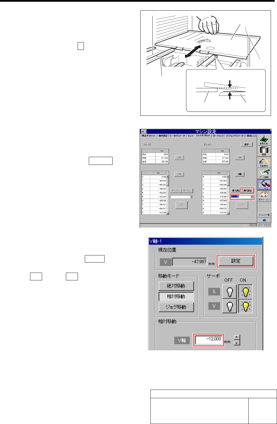 V 軸セットアップ HLF-20314-01 V 軸セット アップ SHEET 9/10 2. S 軸冶具パレットを S 軸レールと V 軸側に 出し入れし、 V 軸36段目と S 軸レ ールとに 段差が無いことを確認します。 3. 段差確認後、 S 軸冶具パレットを装置外に 取り出し、シャッター 閉 ボタンをクリックして トレイ 1 のシャッターを閉じます。 4. V 軸 36 段目と S 軸レールとに段差があっ た場合には、再度手順…