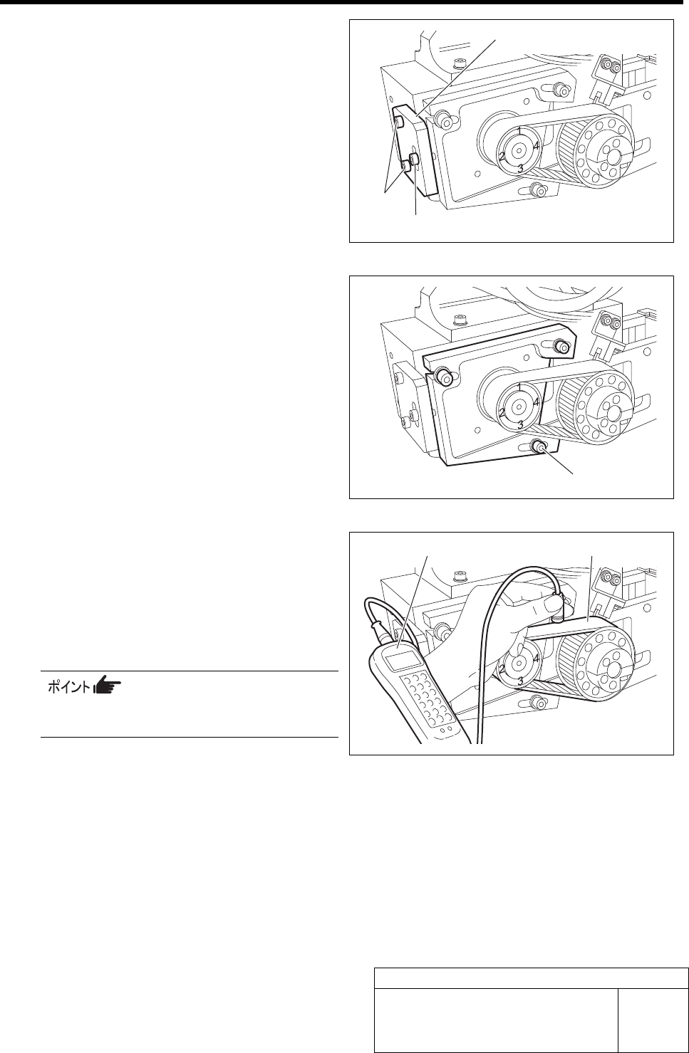 F 軸ベルトテンション調整 HLF-20405-01 F 軸ベルトテンション調整 SHEET 2/3 4 テンションブロック冶 具をフィード部本体に取 り 付けます。 5 F 軸モータ取り付けブラケットのキャップスクリ ュー( 3-M4 )を緩めます。 6 モータプーリーの 1 番から 4 番の位置まで順番 にテンションを測定します。 1. テンションメータの測定端子 を両プーリーの 中間のベルト付近に配置します。 2. ベルトを指で弾…
