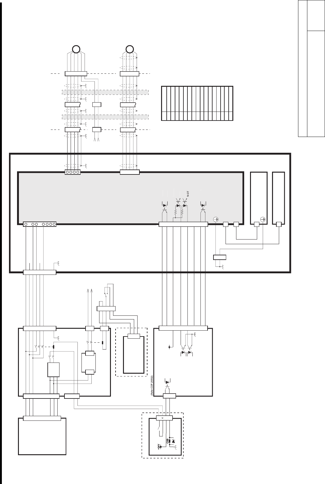 H 軸サーボドライバー周辺回路図 CDF-20506-01 H 軸サー ボドライバー周辺回路 図 SHEET 1/1 CP5 MC1 PS1 L N FG + - CR2 PS5 L N + - SV-E2 1 2 3 CR2 3 4 6 7 8 9 2 3 24 1 2 3 4 5 6 7 8 ALM + ALM - + 24V IN P- OT / DE C /SO 2 + /SO 2 - L1C L2C L1 L2 B1 B2 -…