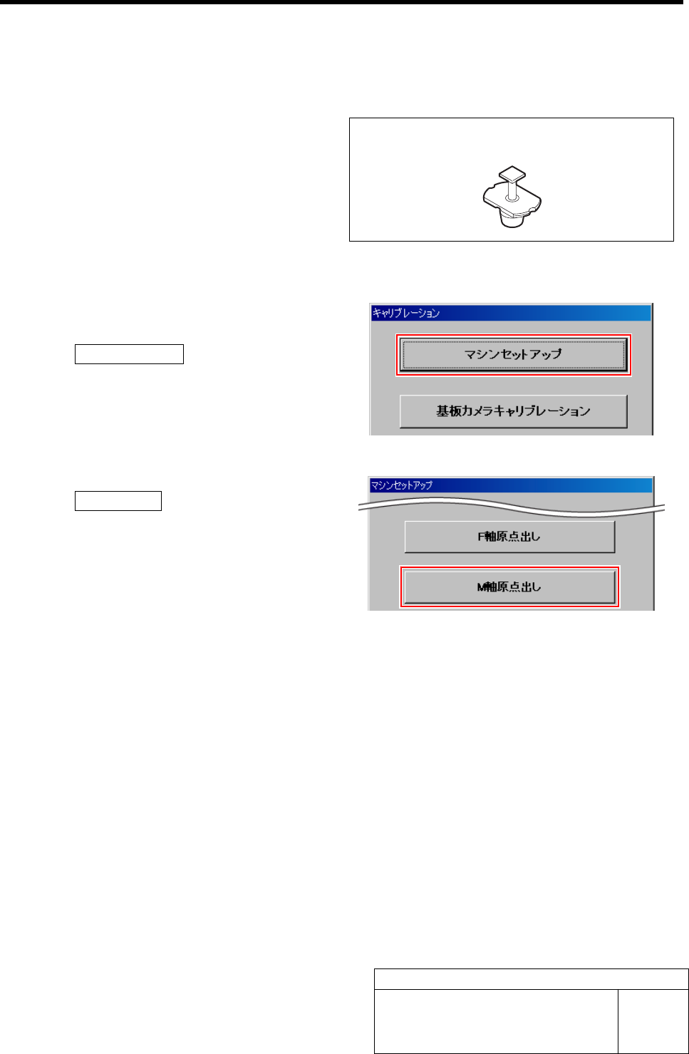 M 軸原点出し HLF-20203-01 M 軸原 点出し SHEET 1/4 M 軸原点出し [必要な冶具] • 冶具ノズル 1 [作業手順] 1 M 軸原点出し画面を表示させます。 1. キャリブレーションメ ニュー画面の マシンセットアップ ボタンをクリックします。 マシンセットアップメニュー画面が表示され ます。 2. マシンセットアップメニュー画面の M 軸 原点出し ボタンをクリックします。 M 軸原点出し画面が表示されます…