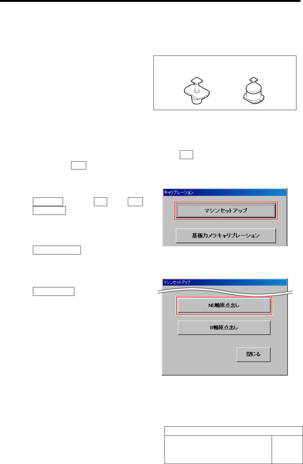 M 軸原点出し HLF-20203-01 M 軸原 点出し SHEET 4/4 5 M 軸原点位置を調整します。 1. ミラーをノズル側にスライドさせ、冶具 ノズル 1 の端面に 押し当てます。 6 M 軸原点位置を保存します。 1. M 軸 原点出し画面の 保存 ボタンをクリック します。 M 軸原点位置が保存され、自 動的にサーボが ON 状態に戻り M 軸原点出し画面が閉じます。 7 冶具ノズル 1 を取り外しま す。 1. マシ…