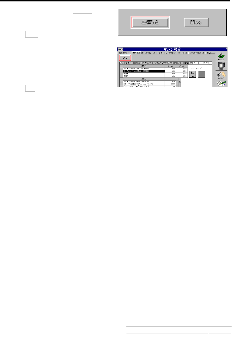 オフセットティーチングセットアップ HLF-20206-01 オフセットティーチングセットアッ プ SHEET 2/3 3. PCBOARD DISPLA Y を確 認しながら、十 字線と冶具マーク 1 の中心 が合うようにジョ グ移動で合わせます。 4. XY ティーチン グ画面の 座標取込 ボタンを クリックします。 冶具マーク 1 の座標が取り込まれます。 5. 閉じる ボタンをクリックして、 XY ティーチ ン グ画面を閉じます…