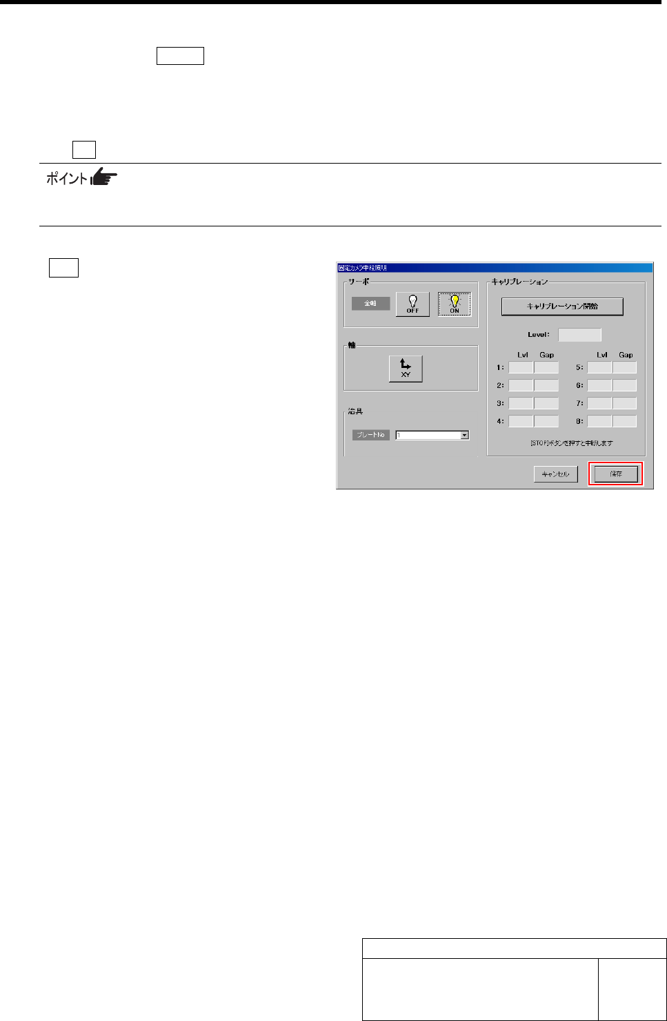 固定カメラ中段照明のキャリブレーション HLF-20307-01 固定カメラ中段照明の キャリブレーション SHEET 2/2 4 固定カメラ中段照明のキャリブレーションを開始します。 1. 操作パネルの ST ART ボタンを押します。 キャリブレーションが開始されます。 数分後、キャリブレーションが 終了し、メッセージ画面に“固定照明用キャリブレーション冶具 を取り外してください” と表示されます。 2. OK ボタンをクリックして…