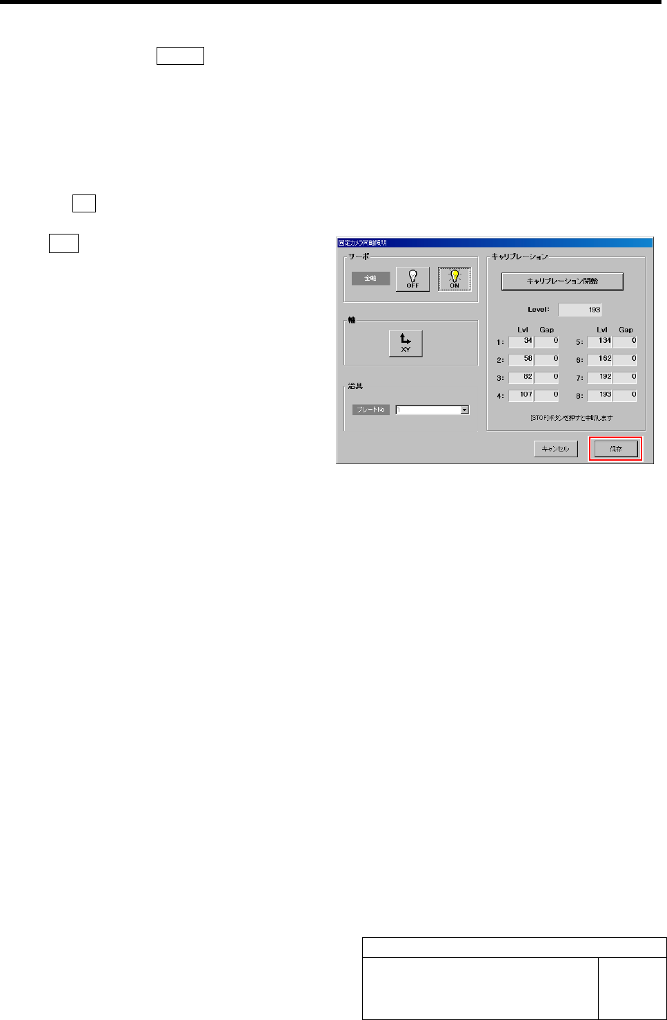 固定カメラ同軸照明のキャリブレーション HLF-20309-01 固定カメラ同軸照明の キャリブレーション SHEET 2/2 4 固定カメラ同軸照明のキャリブレーションを開始します。 1. 操作パネルの ST ART ボタンを押します。 キャリブレーションが開始されます。 数分後、キャリブレーションが 終了し、メッセージ画面に“固定照明用キャリブレーション冶具 を取り外してください” と表示されます。 5 固定カメラライトキャリブレー…