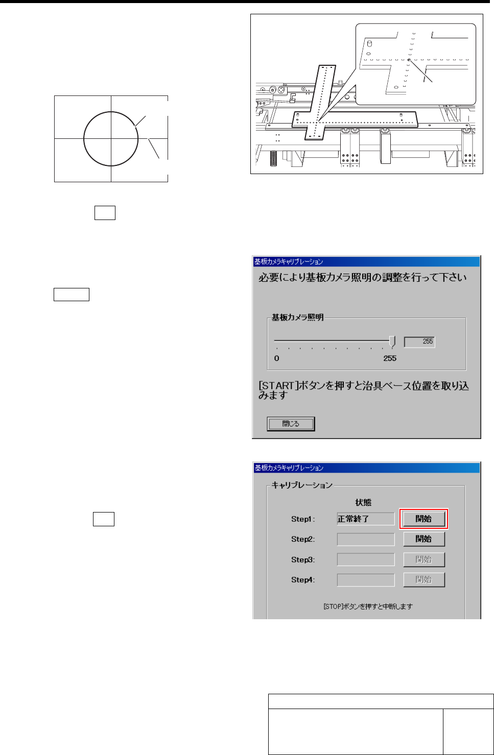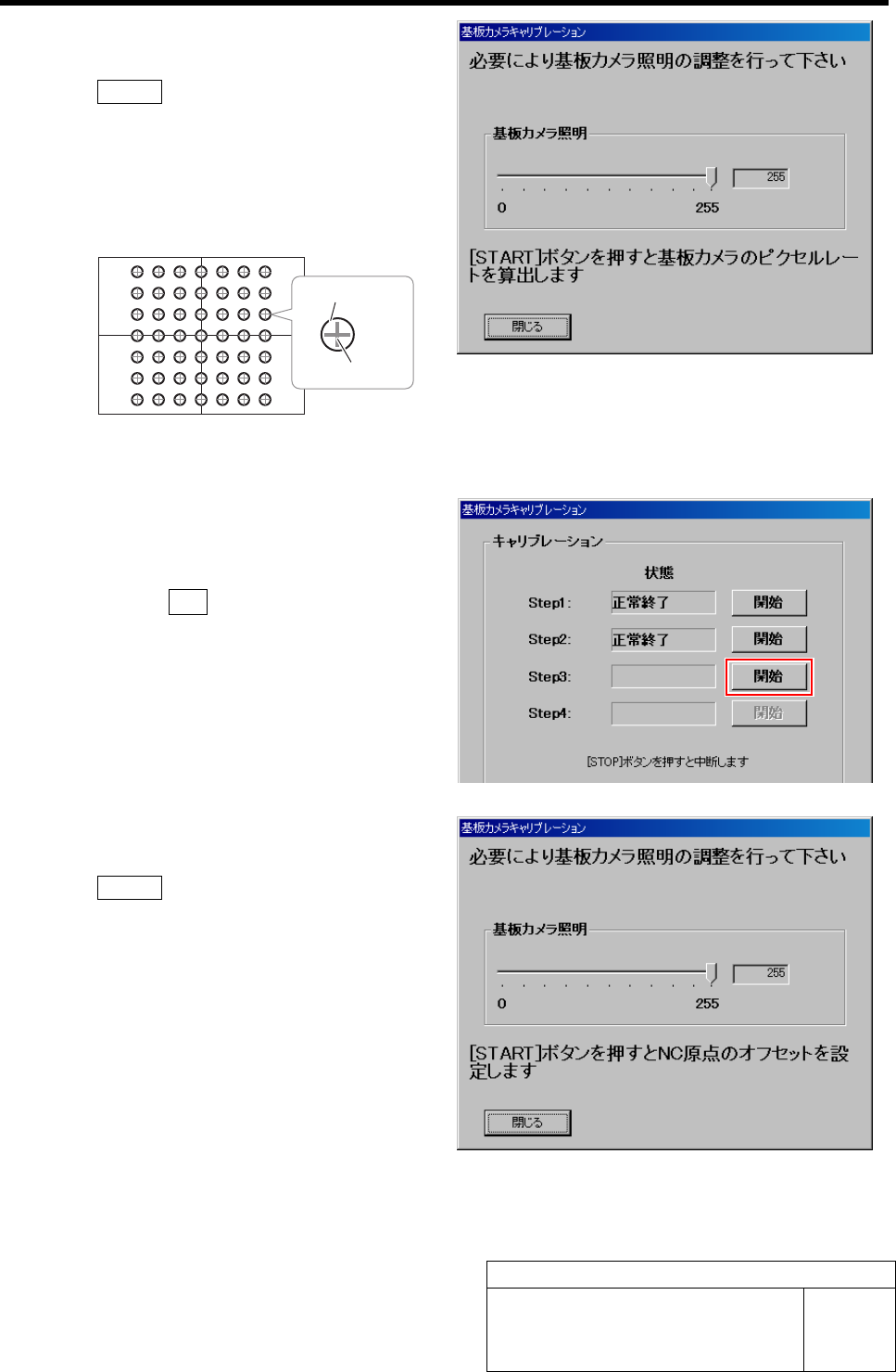基板カメラキャリブレーション HLF-20310-01 基板カメラキャリブレーション SHEET 4/6 3. PCBOARD DISPLA Y を確認しながら、基 板カメラをベースポイント冶具のクロスポイ ント上にジョグ移 動させます。 PCBOARD DISPLA Y の十字線とクロスポイント の穴中心をジョグ移動で合わせます。 4. 基板カメラがクロスポイントに合ったら、 XY 軸画面の 終了 ボタンをクリックします。 XY 軸画…