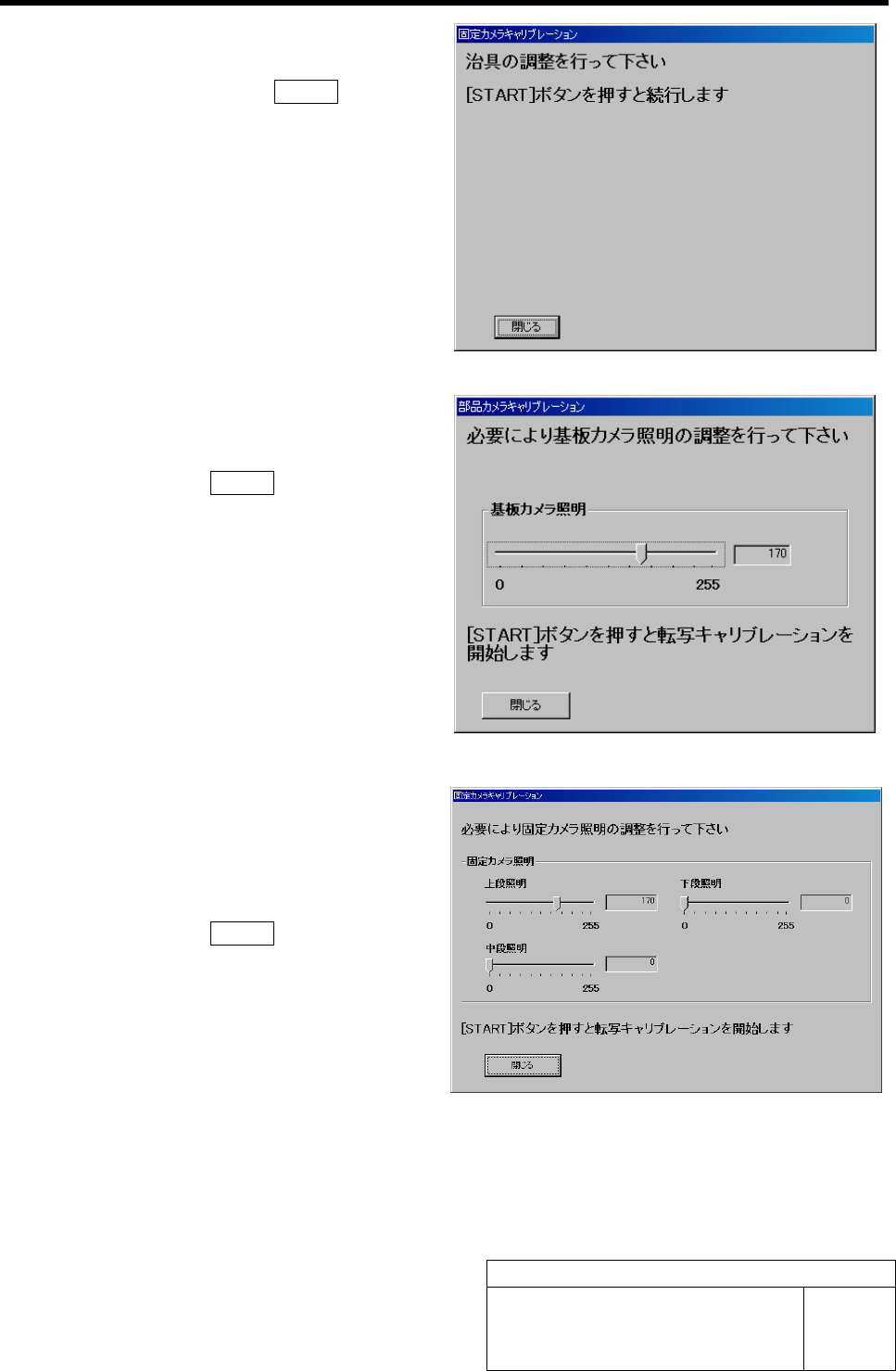 固定カメラキャリブレーション HLF-20312-01 固定カメラキャリブレーション SHEET 6/9 2. キャリブレーションプレート上のカメラキャリ ブレーションプレート( QFP 型)の位置を再 調整し、操作パネルの ST ART ボタンを押 します。 基板カメラ照明の照 度レベル調整画面 が表示さ れます。 3. 基板カメラ照明の照度レベルを調整し、 DISPLA Y 上の映像の影が消えるくらいの 明るさにします。(参考値: …