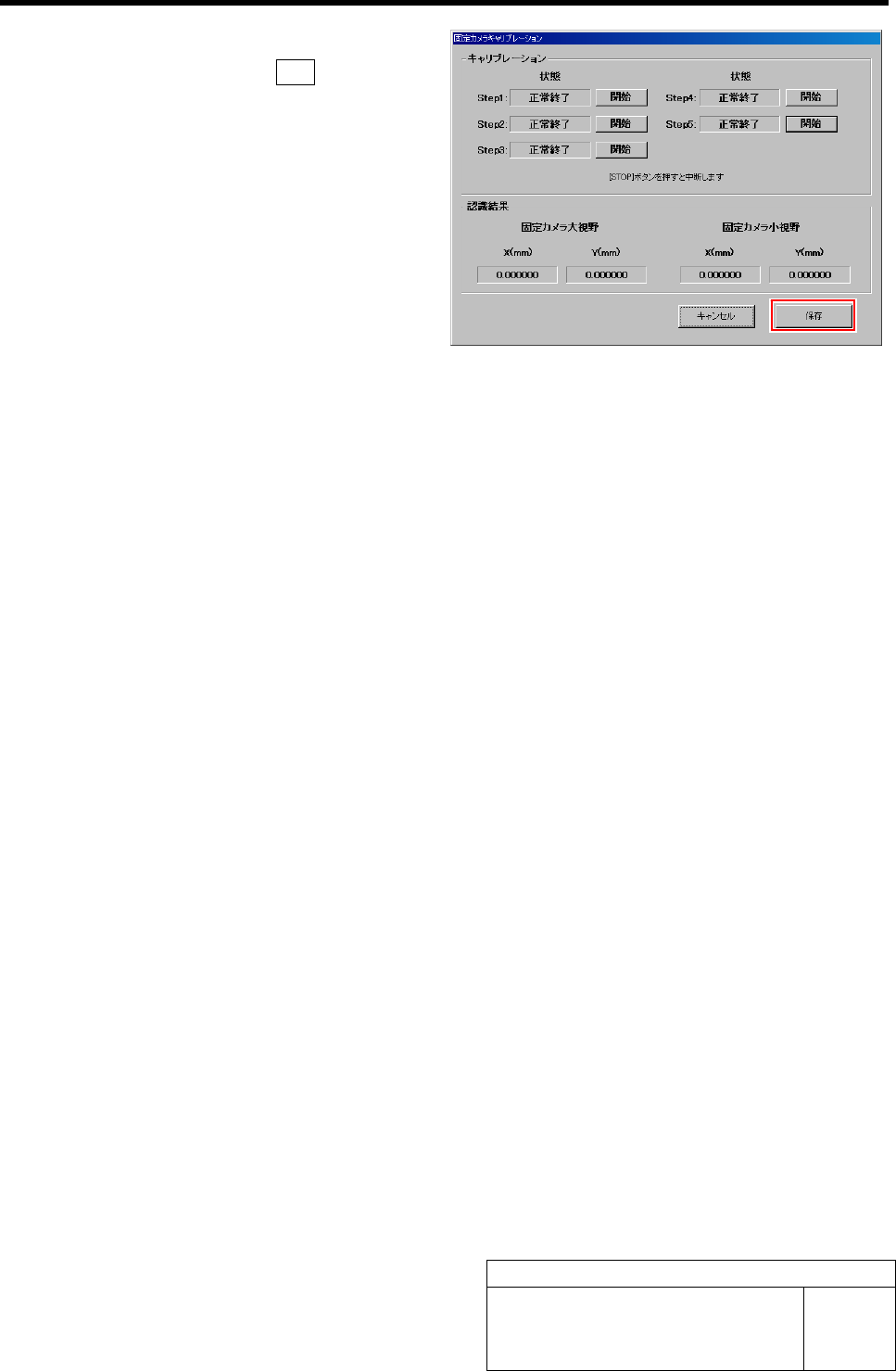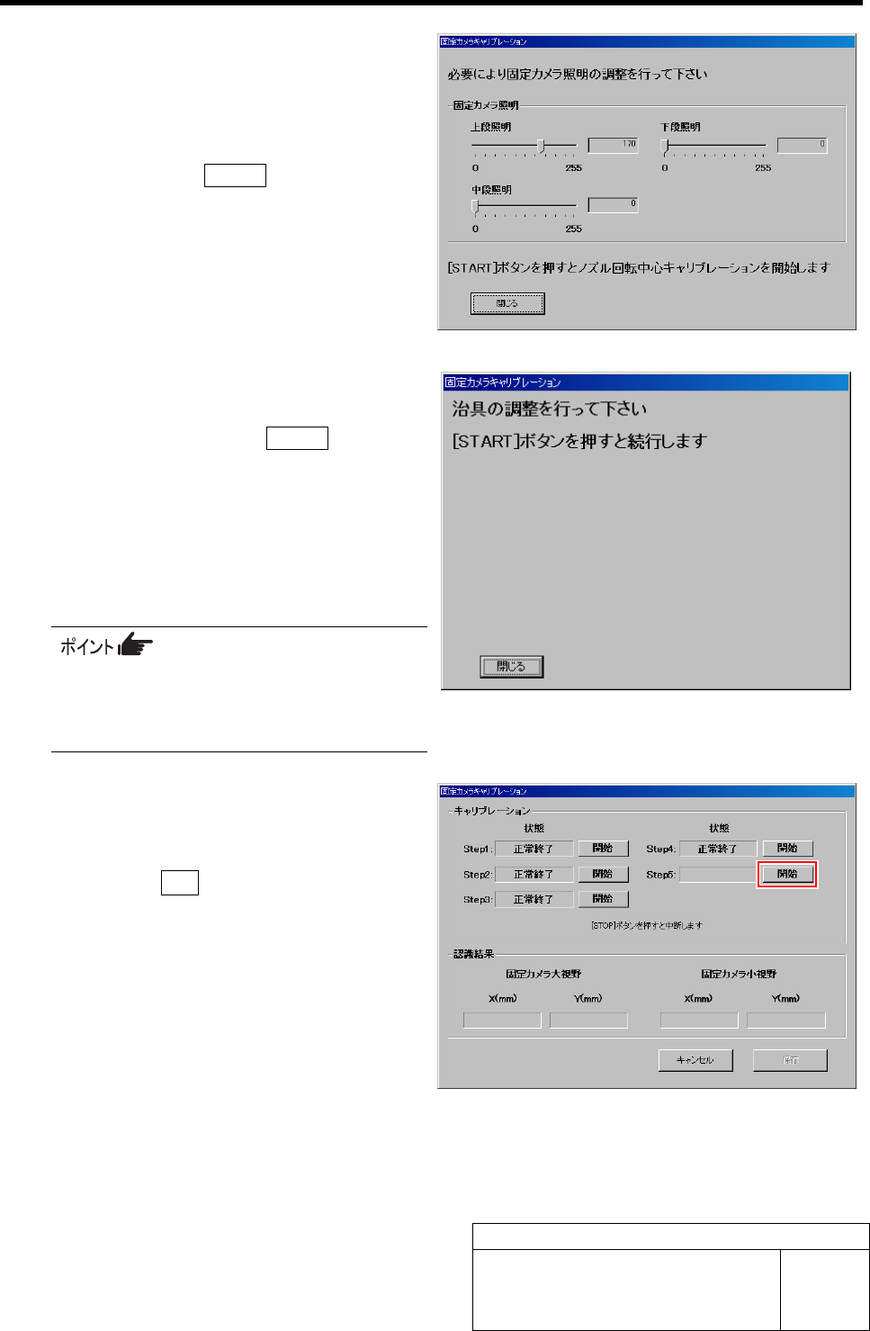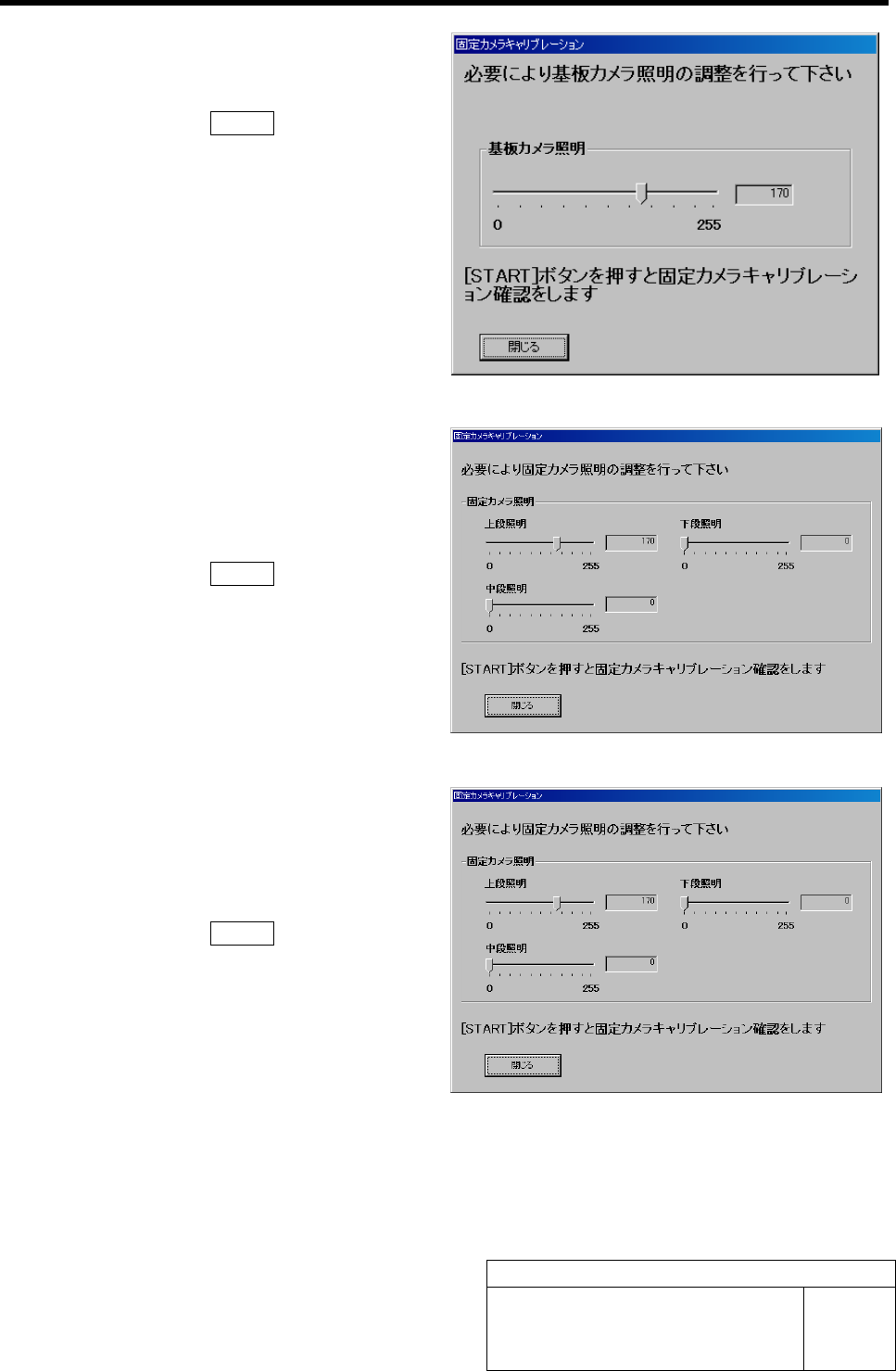 固定カメラキャリブレーション HLF-20312-01 固定カメラキャリブレーション SHEET 8/9 2. 基板カメラ照明の照度レベルを調整し、 DISPLA Y 上の映像の影が消えるくらいの 明るさにします。(参考値: 170 くらい) 3. 操作パネルの ST ART ボタンを押します。 冶具ノズル 5 でカメラキャリブレーションプレート ( QFP 型)を吸着し、カメラで認識します。 固定カメラ照明の 照度レベル調整画面 が表…