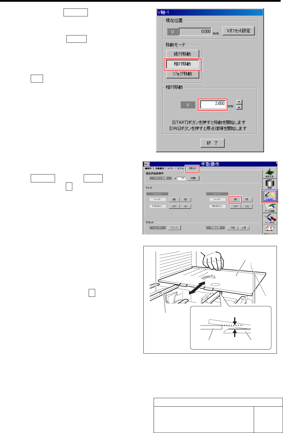 V 軸セットアップ HLF-20314-01 V 軸セット アップ SHEET 5/10 6. 移動モードの 相対移動 ボタンをクリックし ます。 7. 相対移動欄に測定 した段差の値を入 力し、 操作パネルの ST ART ボタンを押します。 V 軸が相対移動します。 例: S 軸に対して V 軸が 2.65 mm 低いときは、 相対移動欄に“ +2.65 mm ”を入力します。 8. 終了 ボタンをクリックして V 軸 -1 画面を…