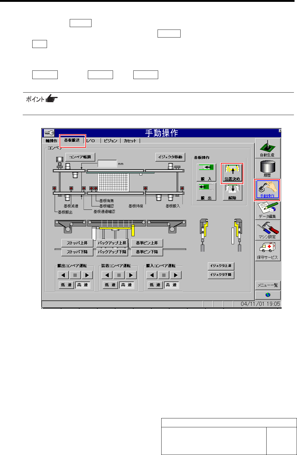 1. 手動操作 メニューÎ基板搬送 タブÎ位置決め ボタンの順にクリックします。
