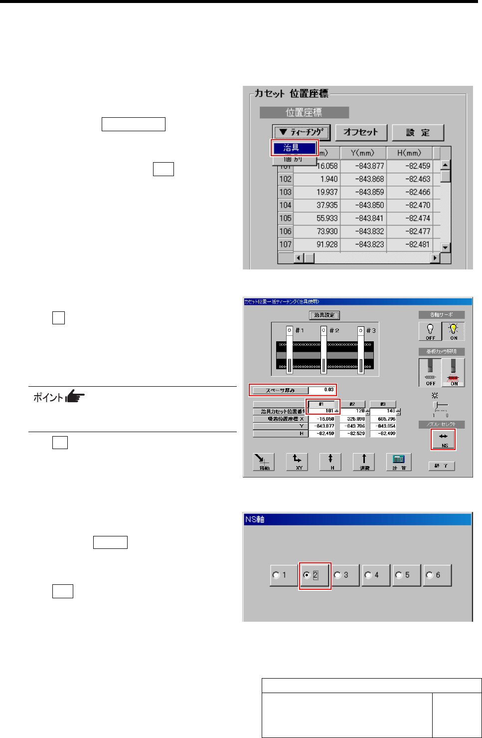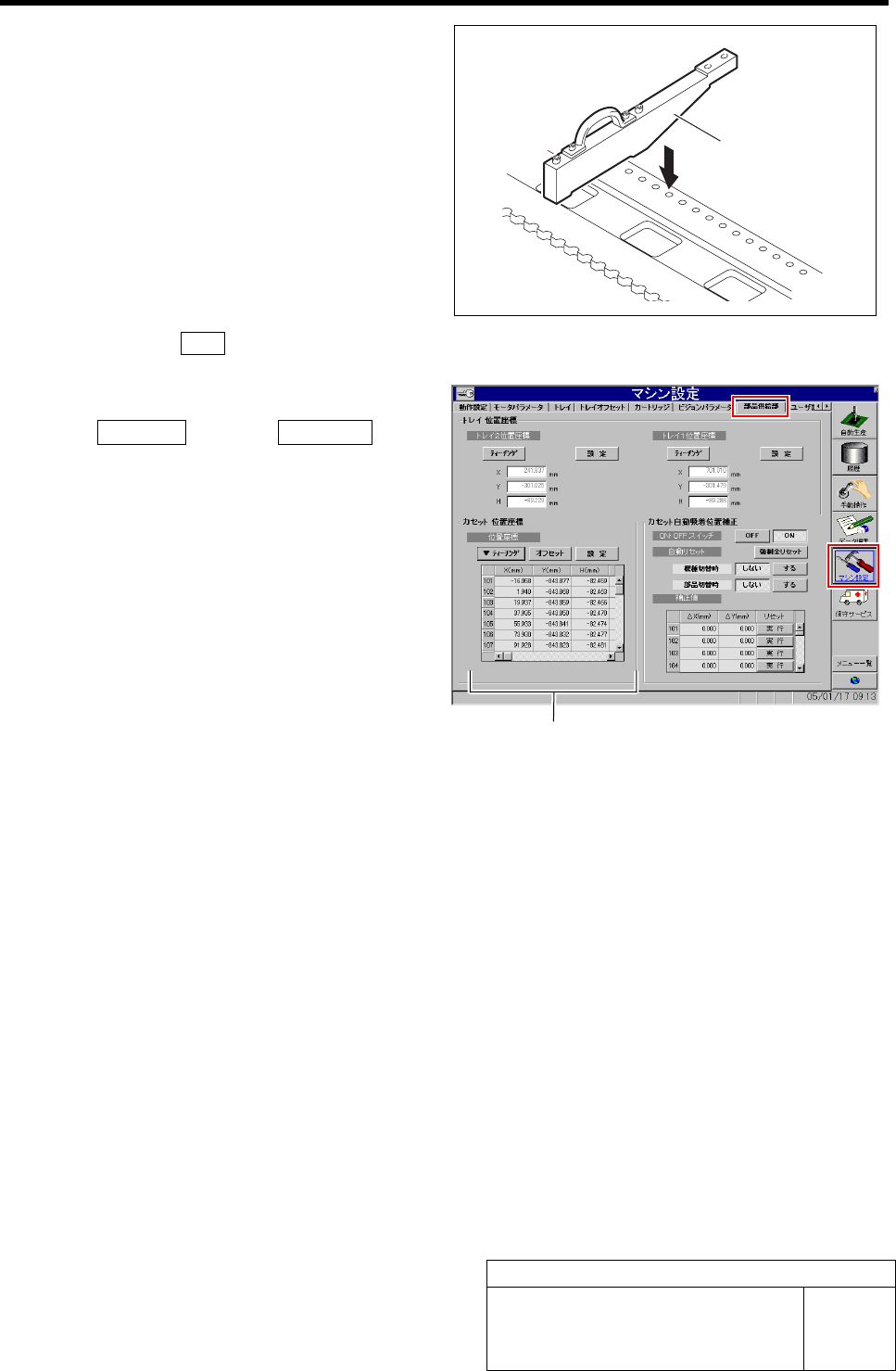 吸着位置セットアップ HLF-20316-01 吸着位置セットアップ SHEET 2/1 1 2 吸着ポイント冶具をセットします。 1. カセットテーブルの Z10 1に吸着ポイント冶 具をセットします。 3 操作パネルの ORG ボタ ンを押して、原点復帰を行い ます。 4 カセット 位置座標を開 きます。 1. マシン設定 メニュー Î 部品供給部 タブ の順にクリック します。 部品供給部画面の左 部分にカセット位置座標 が表示さ…